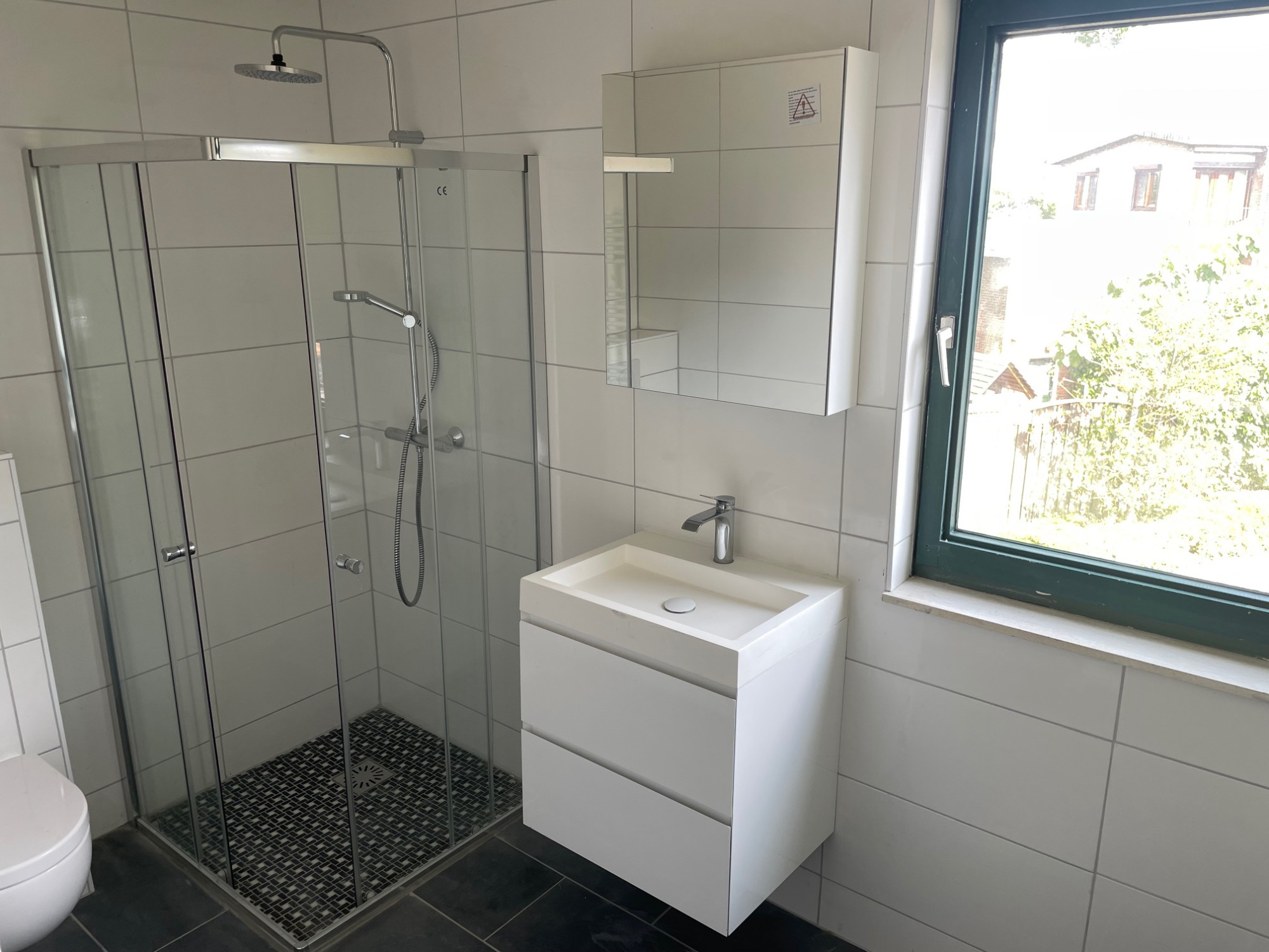 Moderne badkamer met inloopdouche, wandcloset, en badmeubel met vaste wastafel.