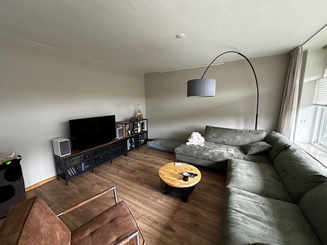 Ruime woonkamer met nieuwe eiken laminaatvloer met veel lichtinval en een balkon waar het rustig vertoeven is.
