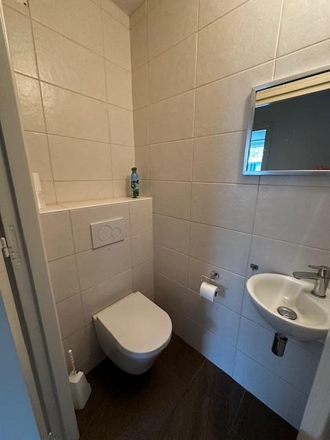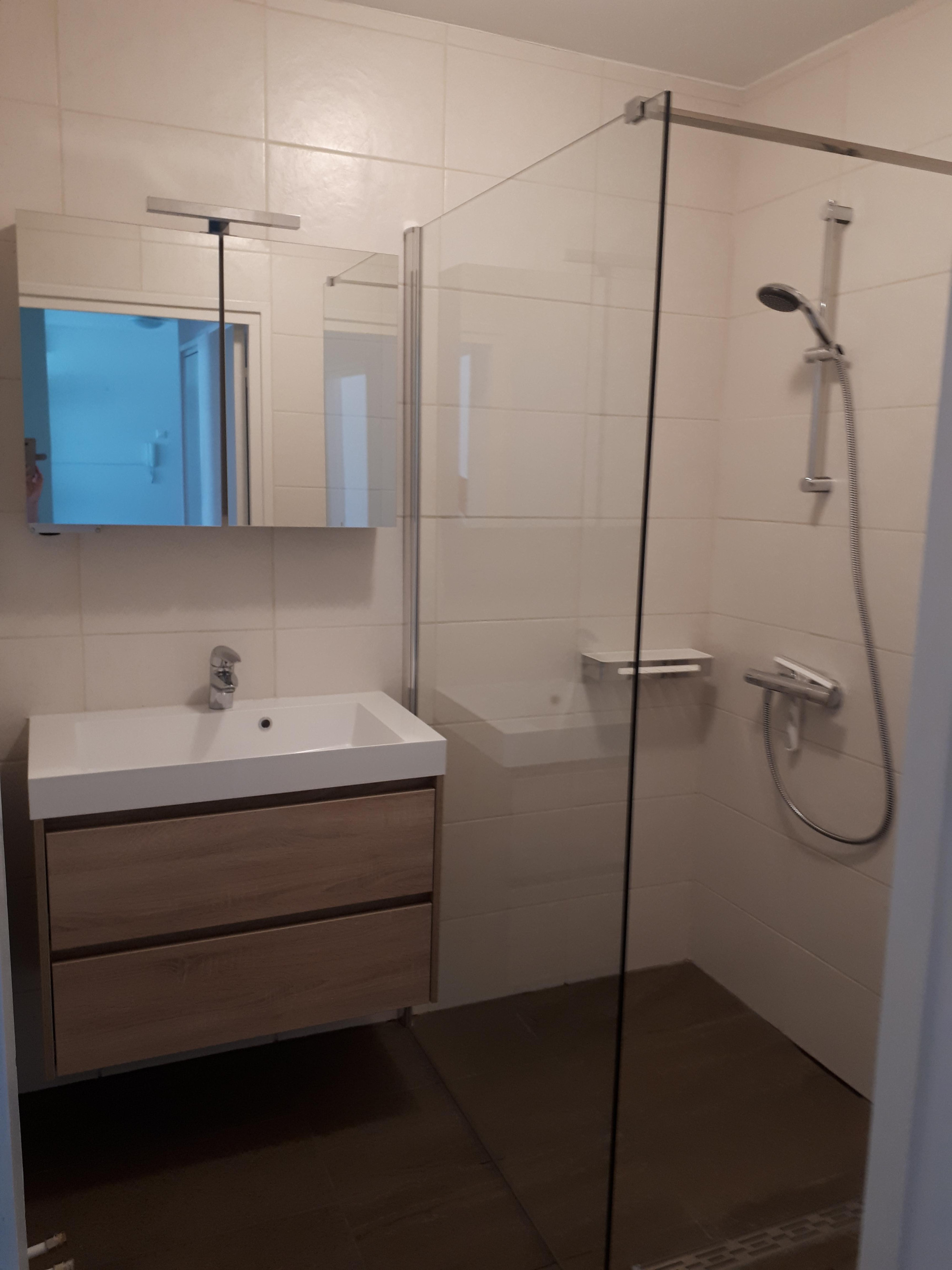 Geheel betegelde badkamer met een nieuwe inloopdouche en toilet.