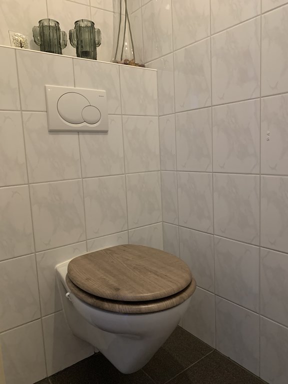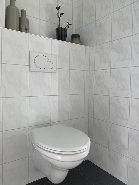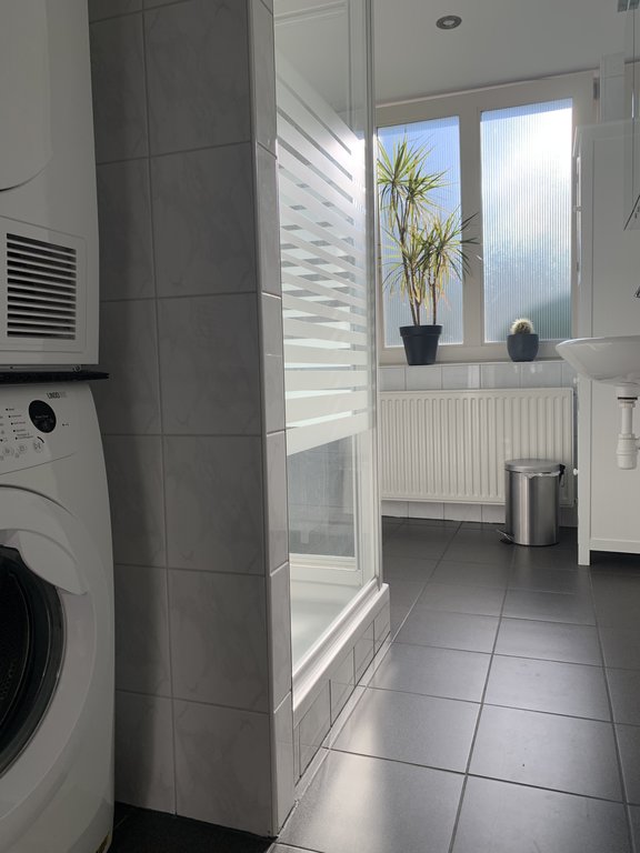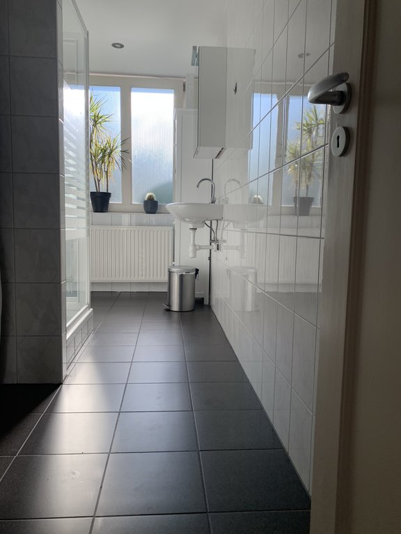 Ruime badkamer (4.64 x 1.82 m) met 2e toilet, douche, vaste wastafel en opstelplaats voor wasautomaat en droger.