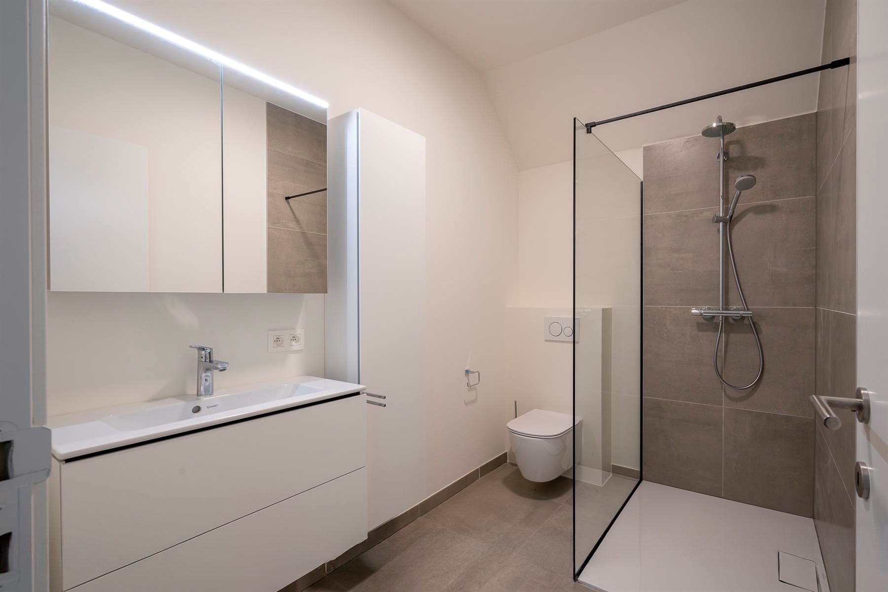 The modern bathroom has a walk-in shower, a double sink integrated into the bathroom cabinet, a mirror cabinet with LED lighting, and a toilet.