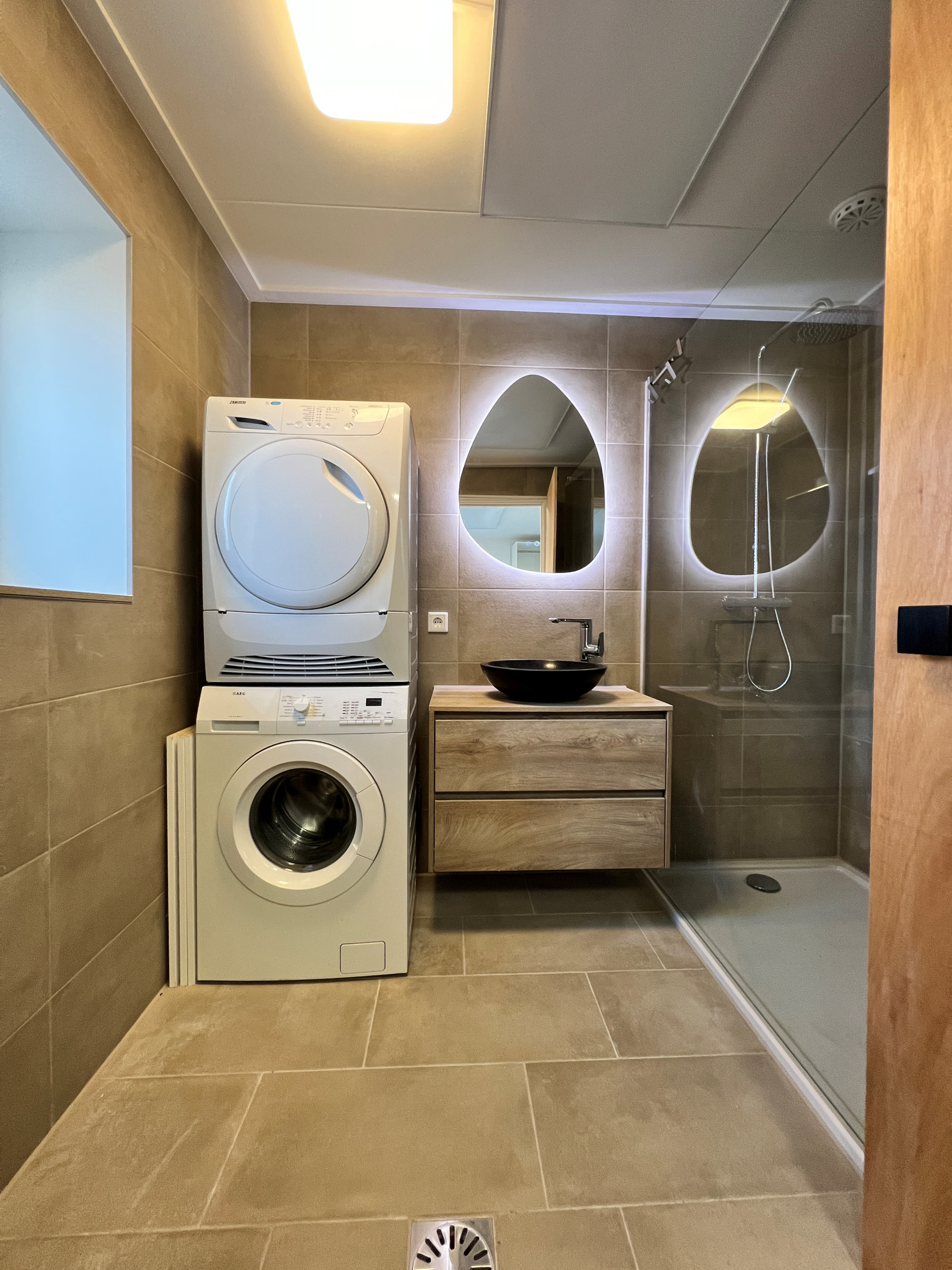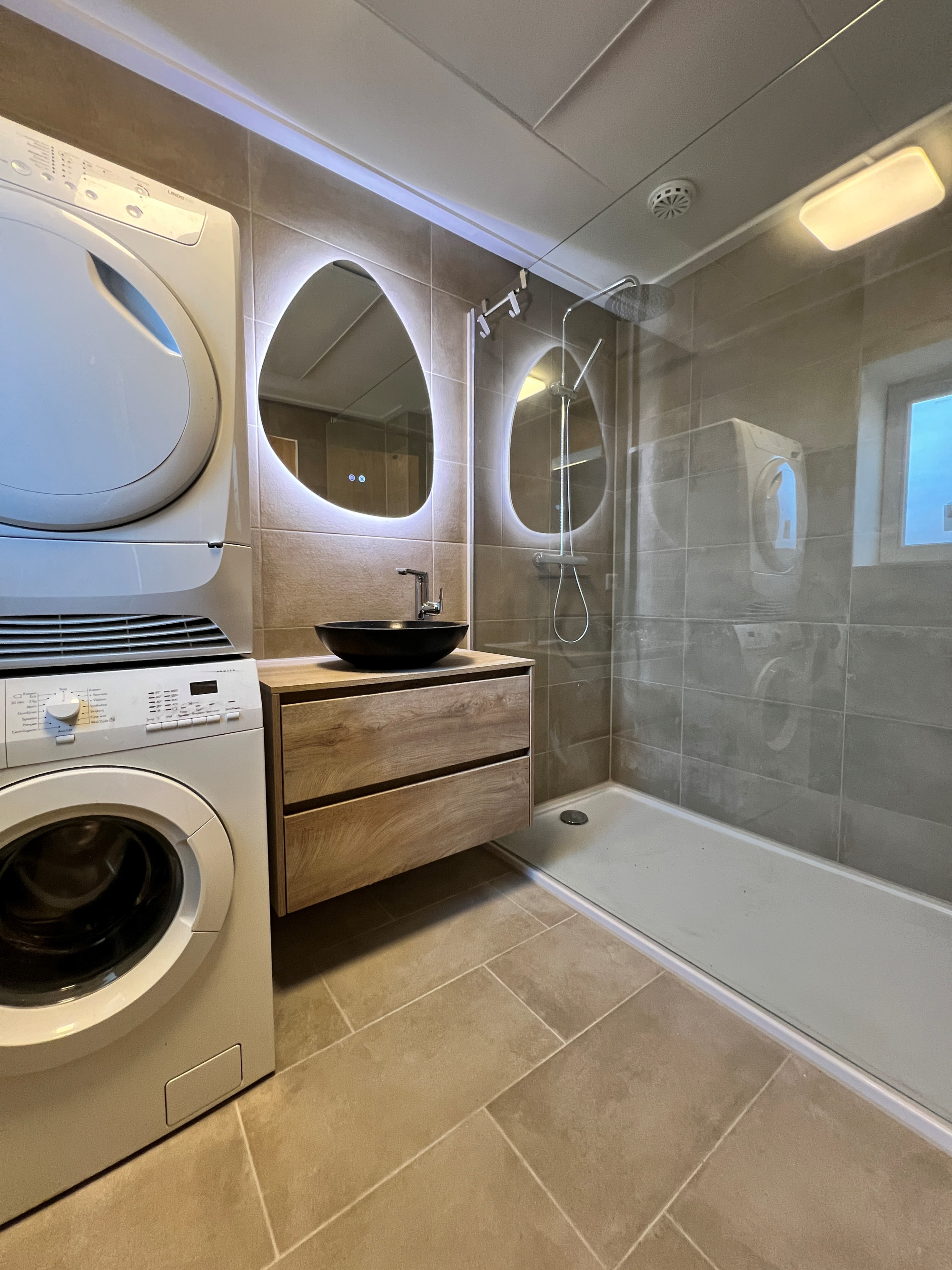 The apartment is offered furnished and is located on the ground floor. The modern kitchen is equipped with a refrigerator, induction hob, extractor hood, dishwasher and oven. The bedroom provides access to the bathroom which is equipped with a washbasin, walk-in shower and washing machine and dryer. The toilet is located separately. There is also a private terrace at the rear of the building. The apartment is heated by air conditioning and infrared panels.