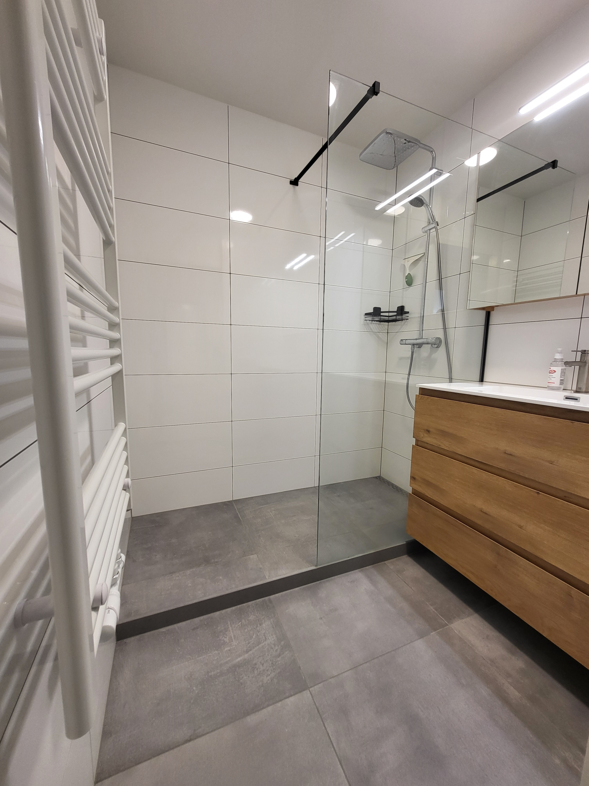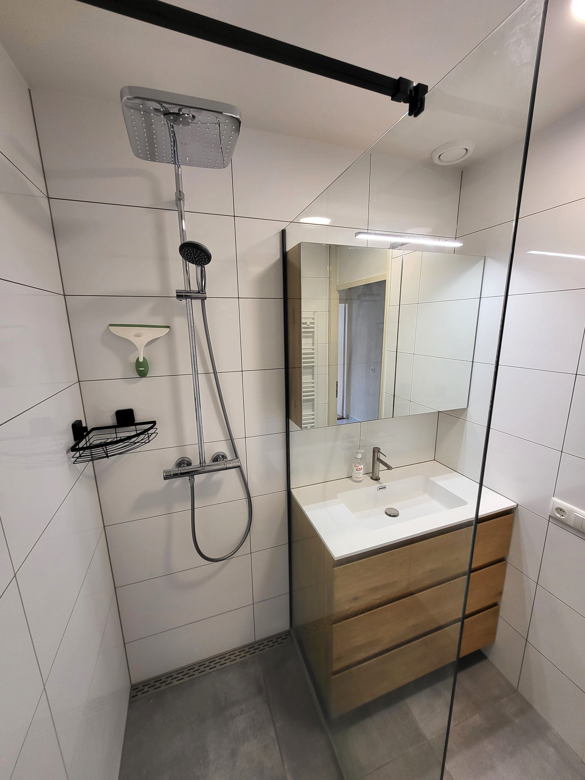 The new bathroom features a spacious walk-in shower, modern washbasin with mirror, and designer radiator. The separate spacious toilet with sink is also accessible from the hallway.