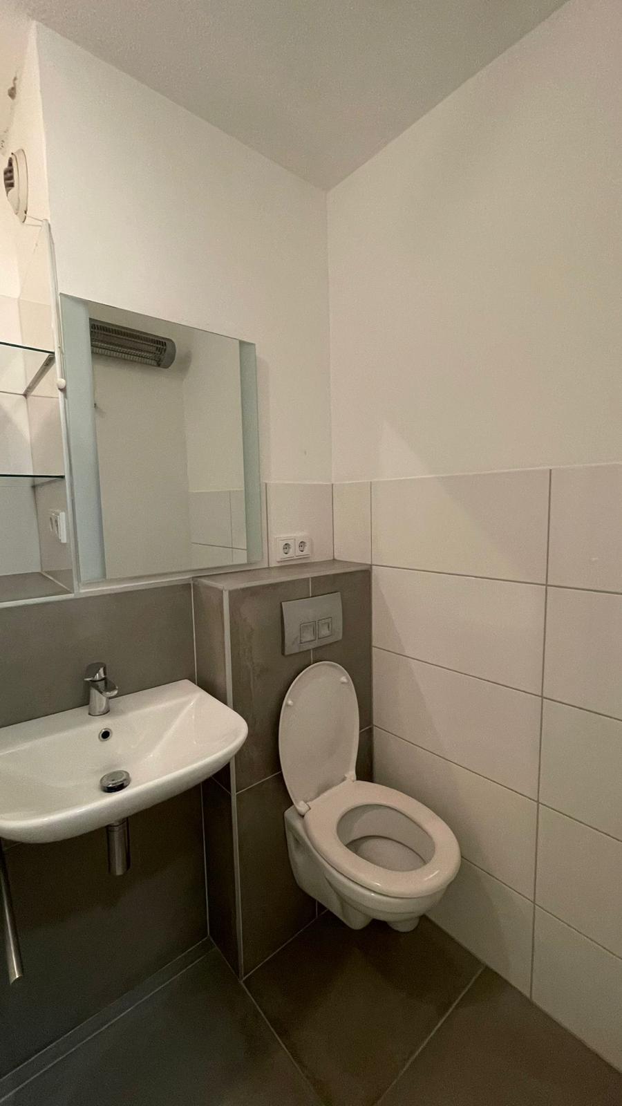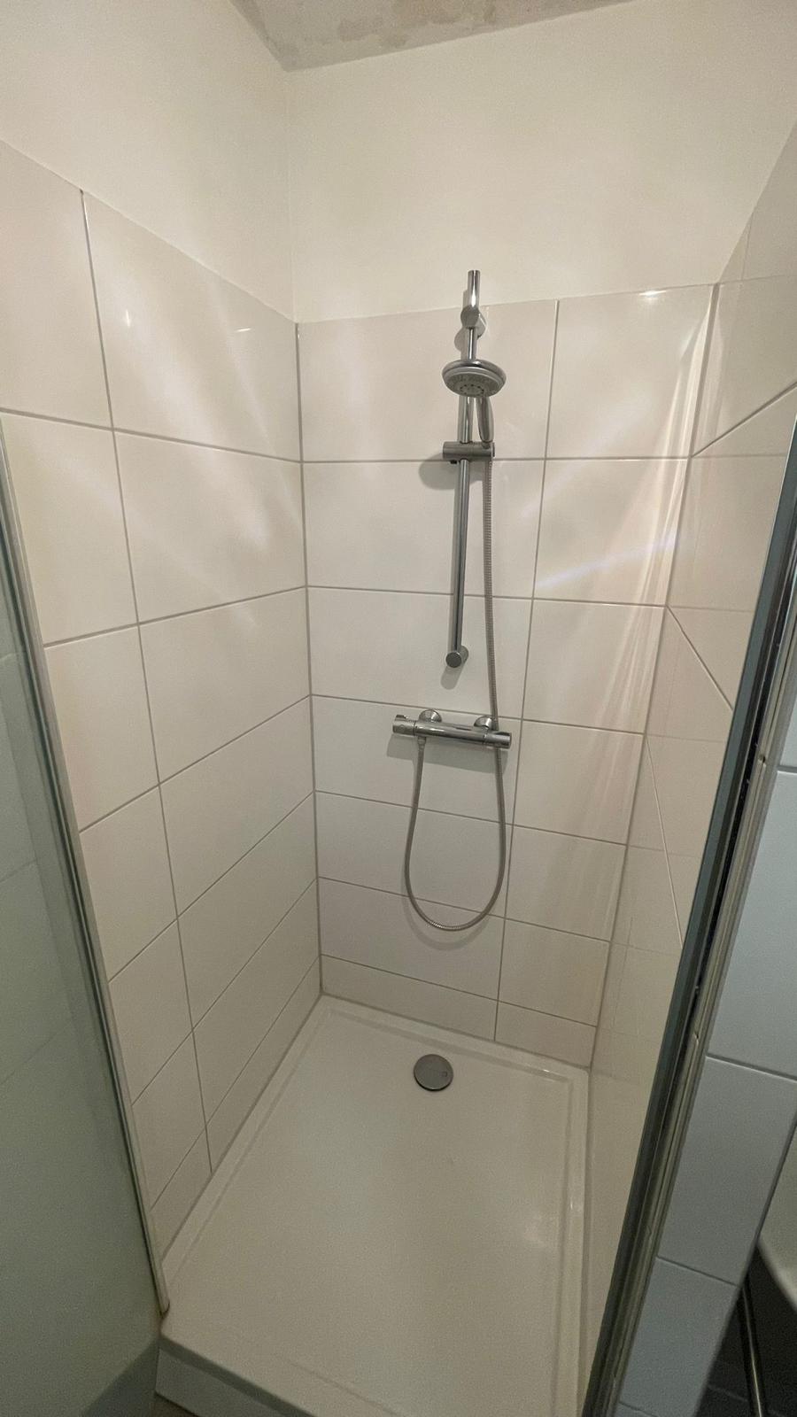 - Geheel betegelde badkamer voorzien van douche, wastafel en toilet.