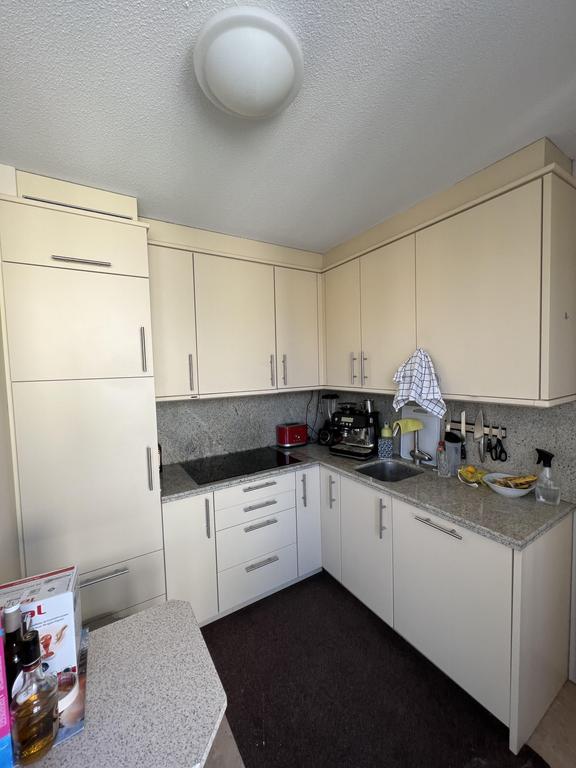 - open keuken met moderne keukenopstelling voorzien van natuurstenen aanrechtblad, vaatwasser, keramische kookplaat, afzuigkap en koelkast