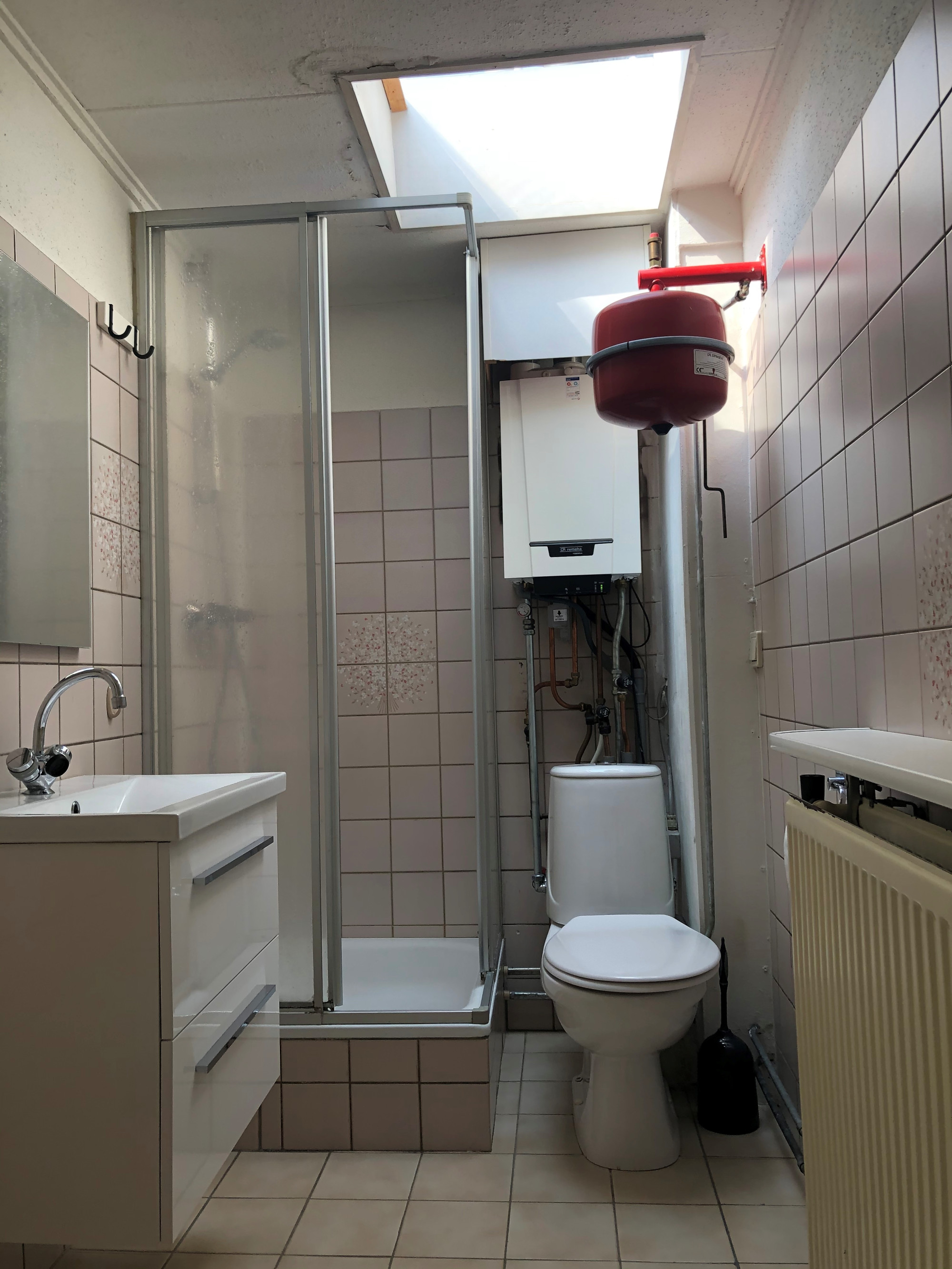The apartment is located on the first floor. The living room with open kitchen enjoys a lot of light and offers a beautiful view of the Limburg hills. The kitchen is equipped with a simple kitchen unit with extractor hood and 4 burner gas stove. From the bedroom of approx. 12 m2 you also have access to the roof terrace. The bathroom is equipped with a shower cabin, sink and washing machine connection. The rented property also includes a private parking space and storage room.