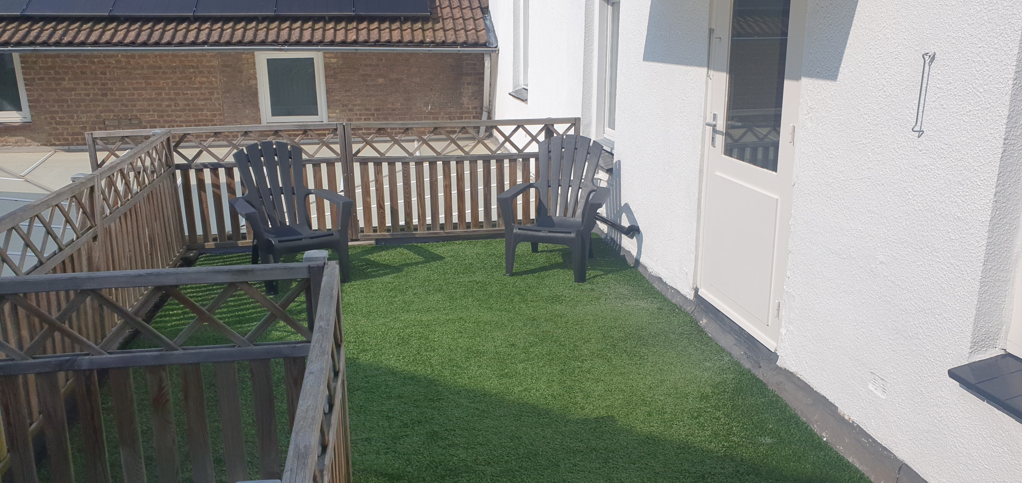 The apartment is in PERFECT condition of finishing. The entire apartment has been re-whitened, equipped with wood-look vinyl floors in the living room with open kitchen, carpeting in the bedrooms and white duo roller blinds in the living room and bedrooms. The spacious roof terrace is equipped with high-pile artificial grass.