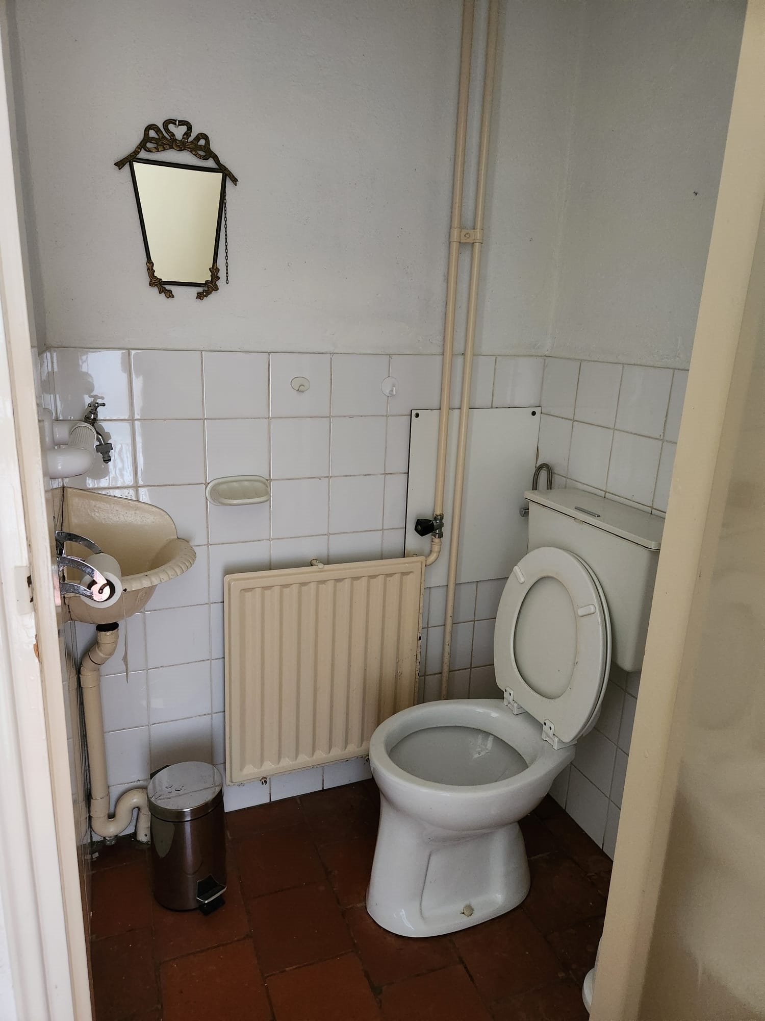 You enter this charming, yet simple house through the hall, from where you have access to the toilet and the charming living room with open kitchen. The fireplace in the living room can function perfectly as heating in the winter months.