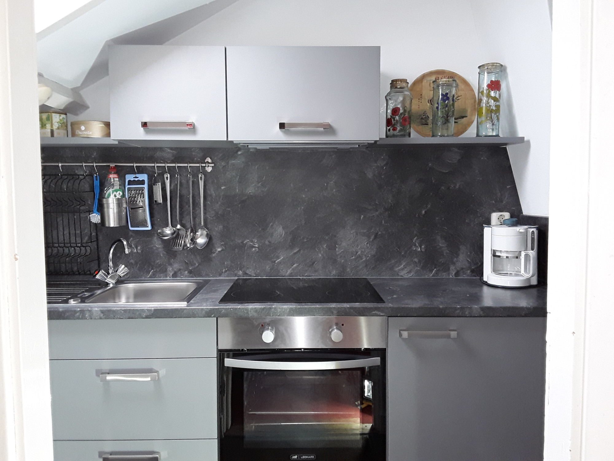 This studio has its own kitchen which is equipped with an oven, 4-burner stove and refrigerator. The compact bathroom has a toilet, shower and sink.