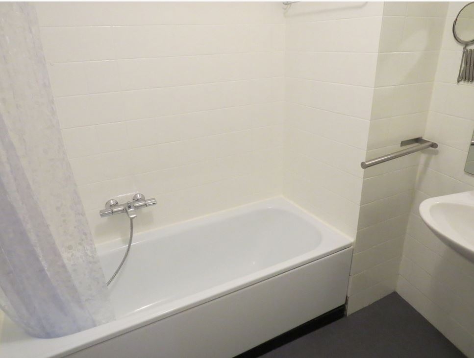 Directly off the centrally located hall, with a wardrobe alcove, is a spacious, separate toilet. The bathroom, with a bathtub, is also located further in the apartment. On the corner is the master bedroom, which has a playful triangular shape. This bedroom also features a practical storage closet/storage space.