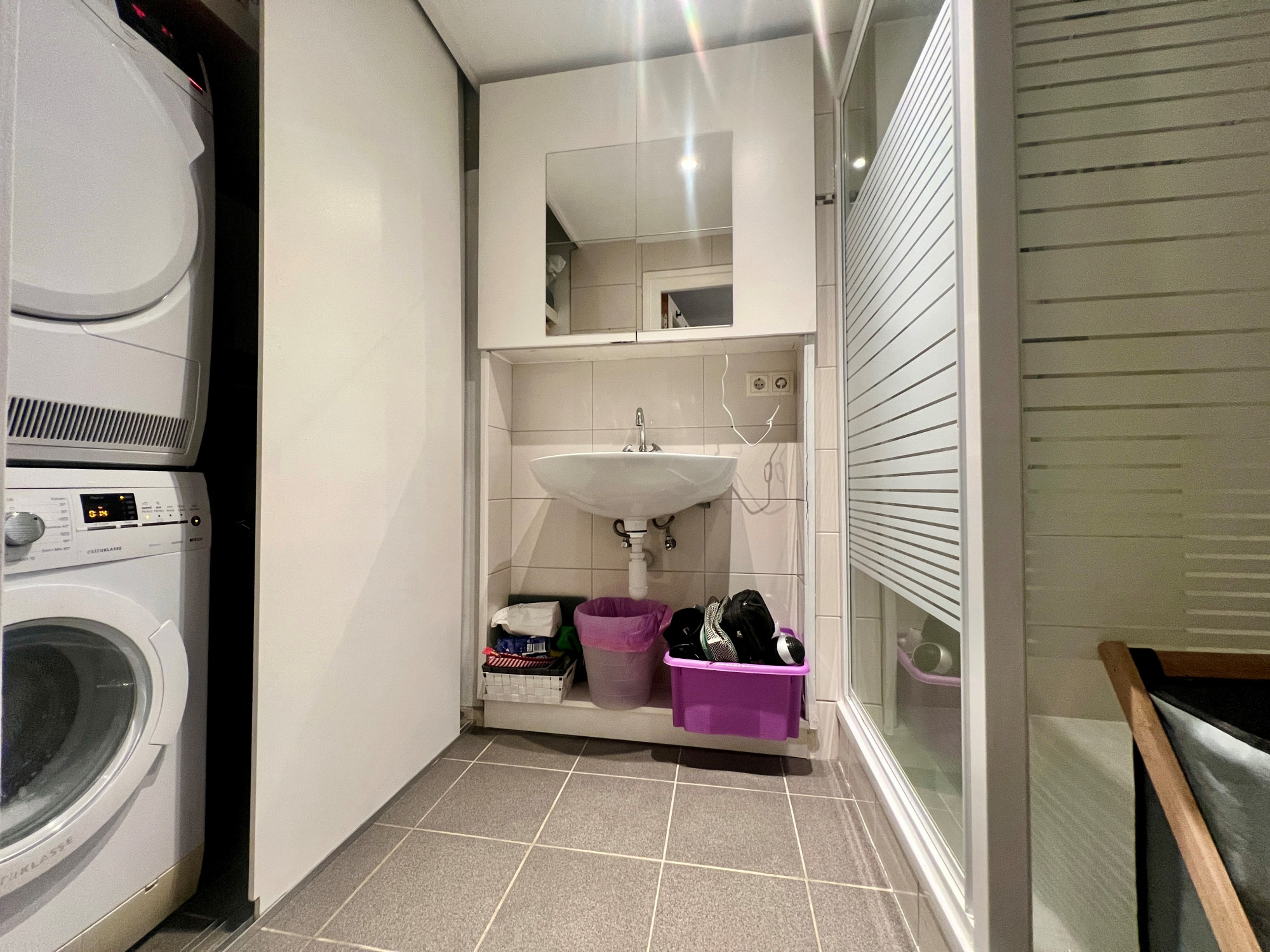 The bathroom is equipped with a shower cabin, sink and connection for white goods.