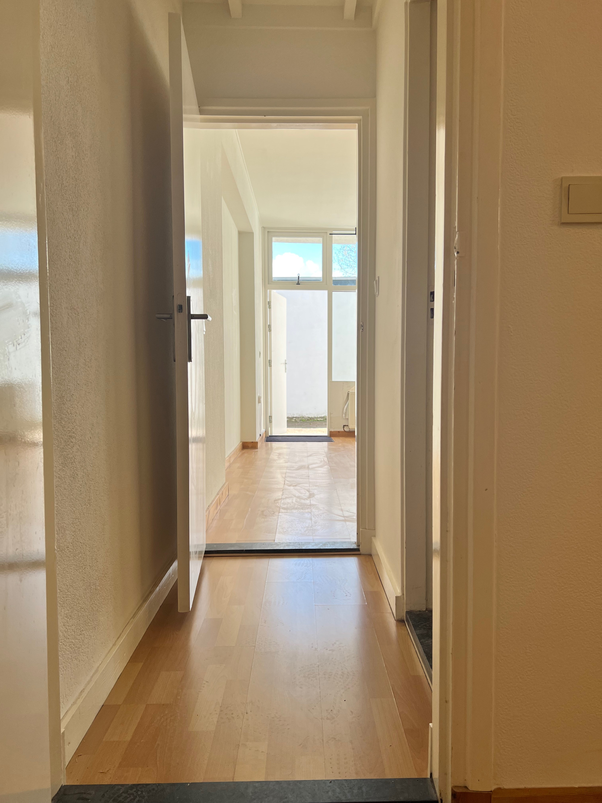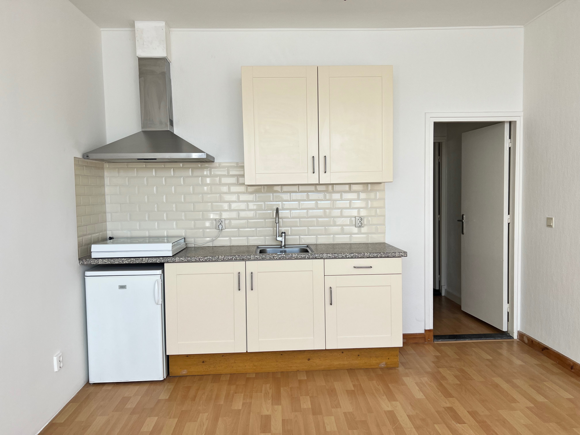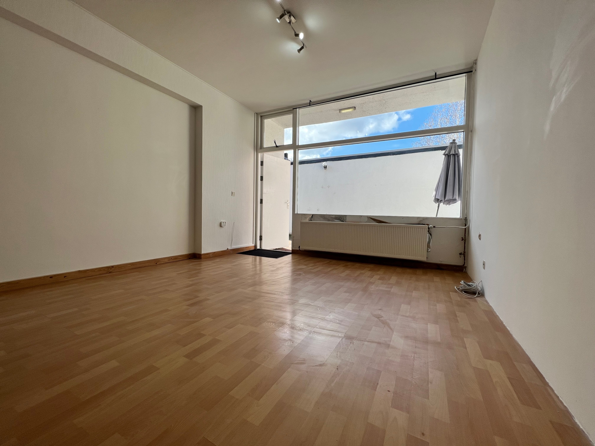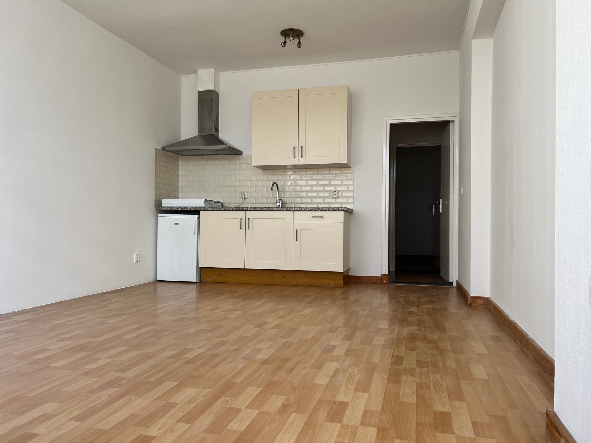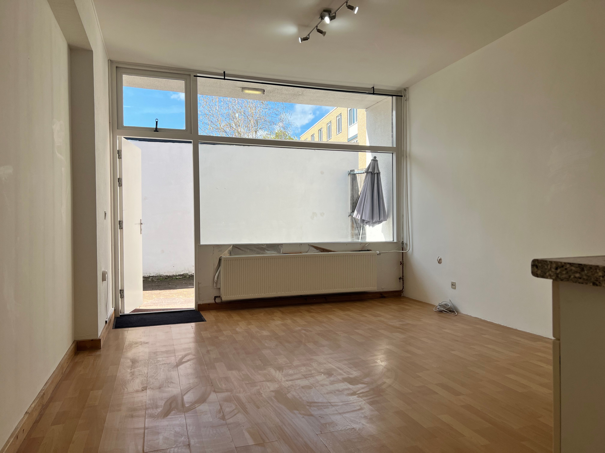 The apartment on the ground floor has a living room with open kitchen of approximately 20m2. The kitchen is equipped with a 4-burner stove, refrigerator and extractor hood. The bathroom has a shower, toilet, sink and washing machine connection. The bedroom is located at the rear.