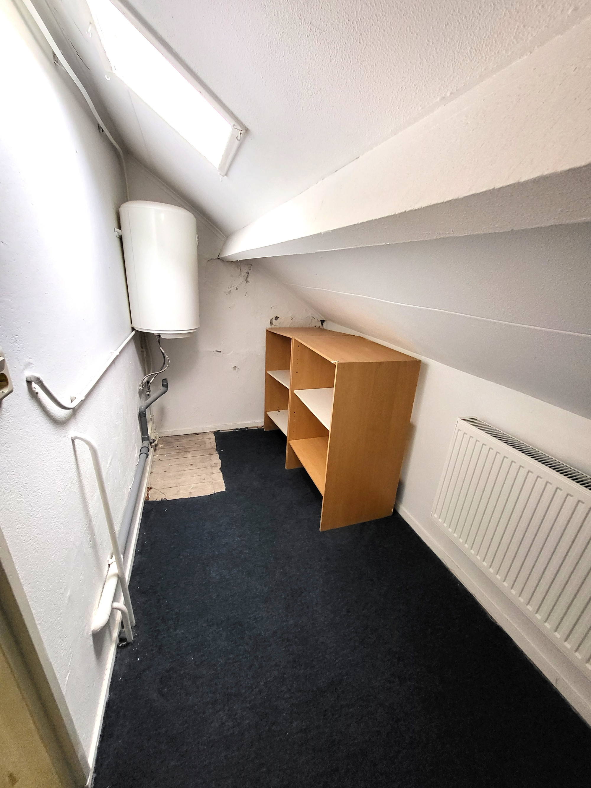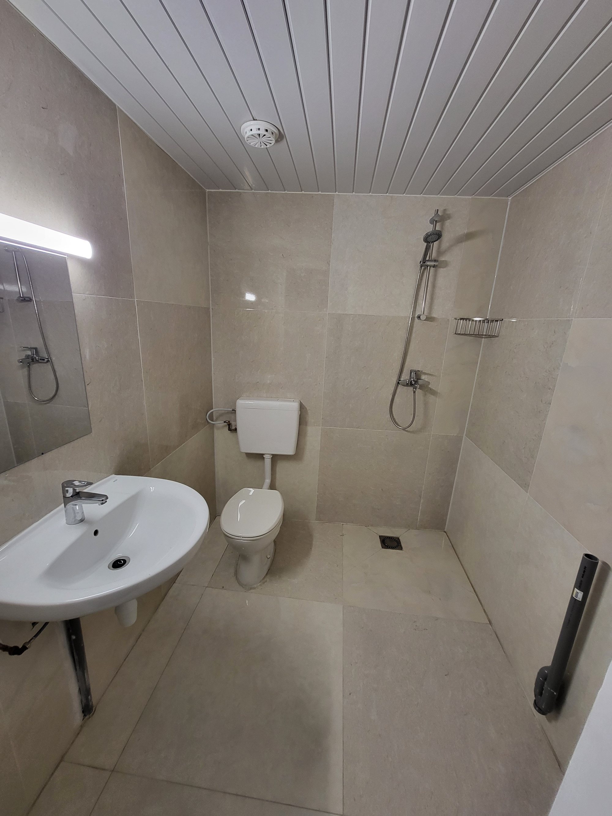 The new bathroom is equipped with a shower, sink, washing machine connection, and toilet. Next to the bathroom is a storage room of approximately 5 m2.