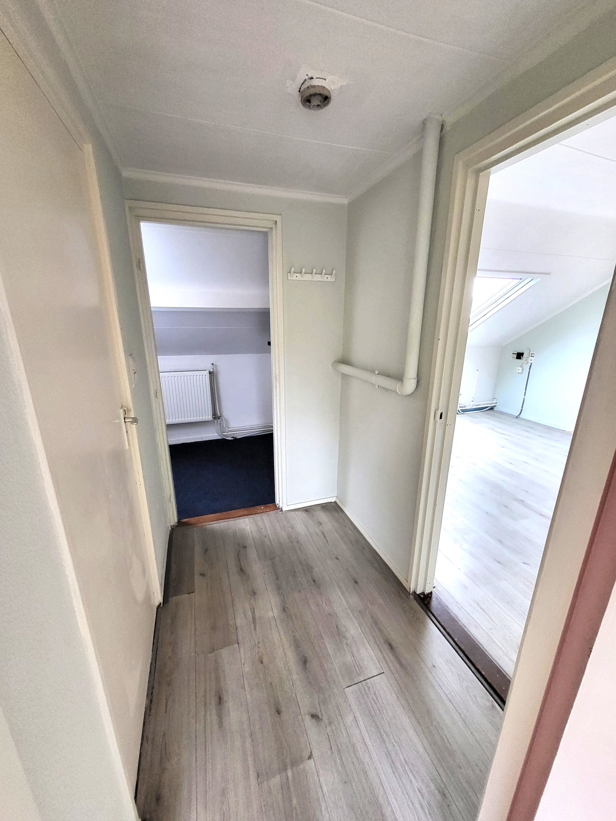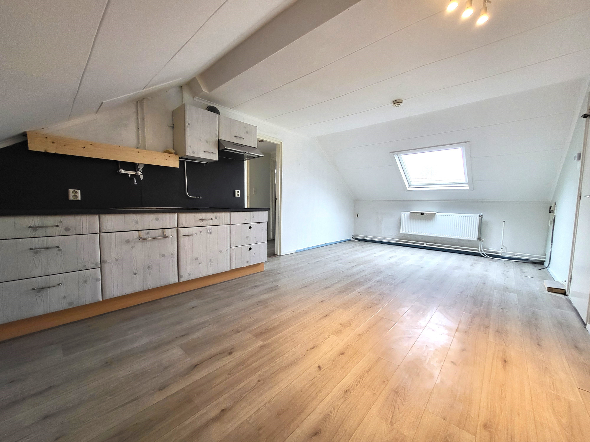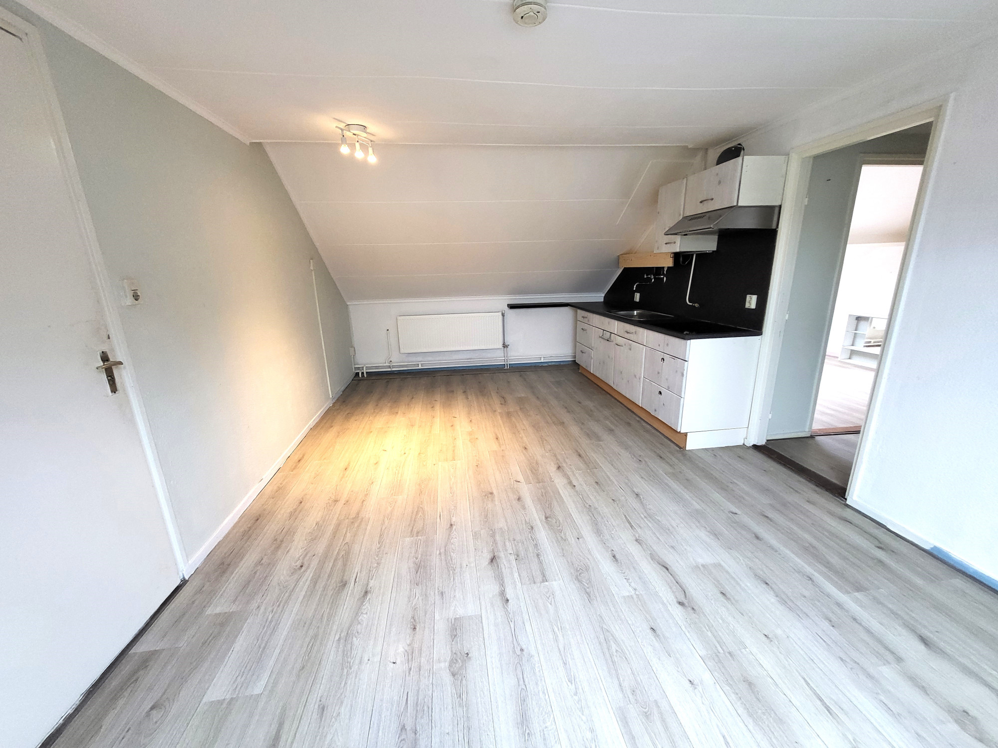 The living room with open kitchen is 22 m2 and has sloping walls at the front and back. The bedroom is approximately 10m2.