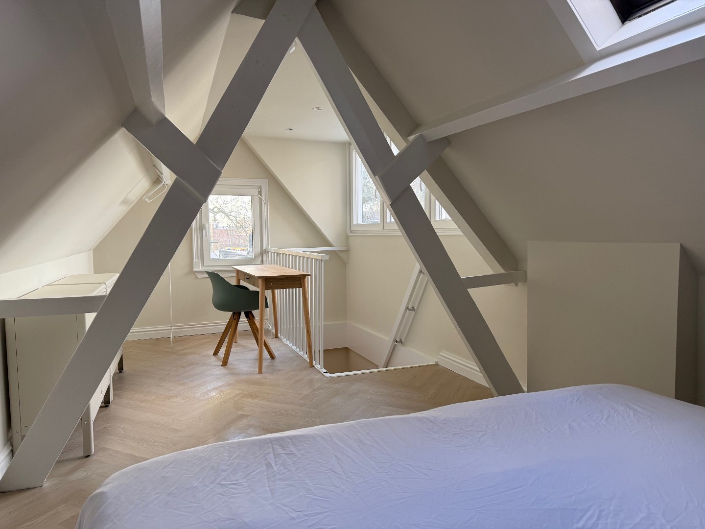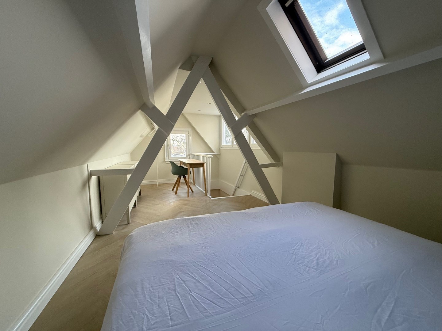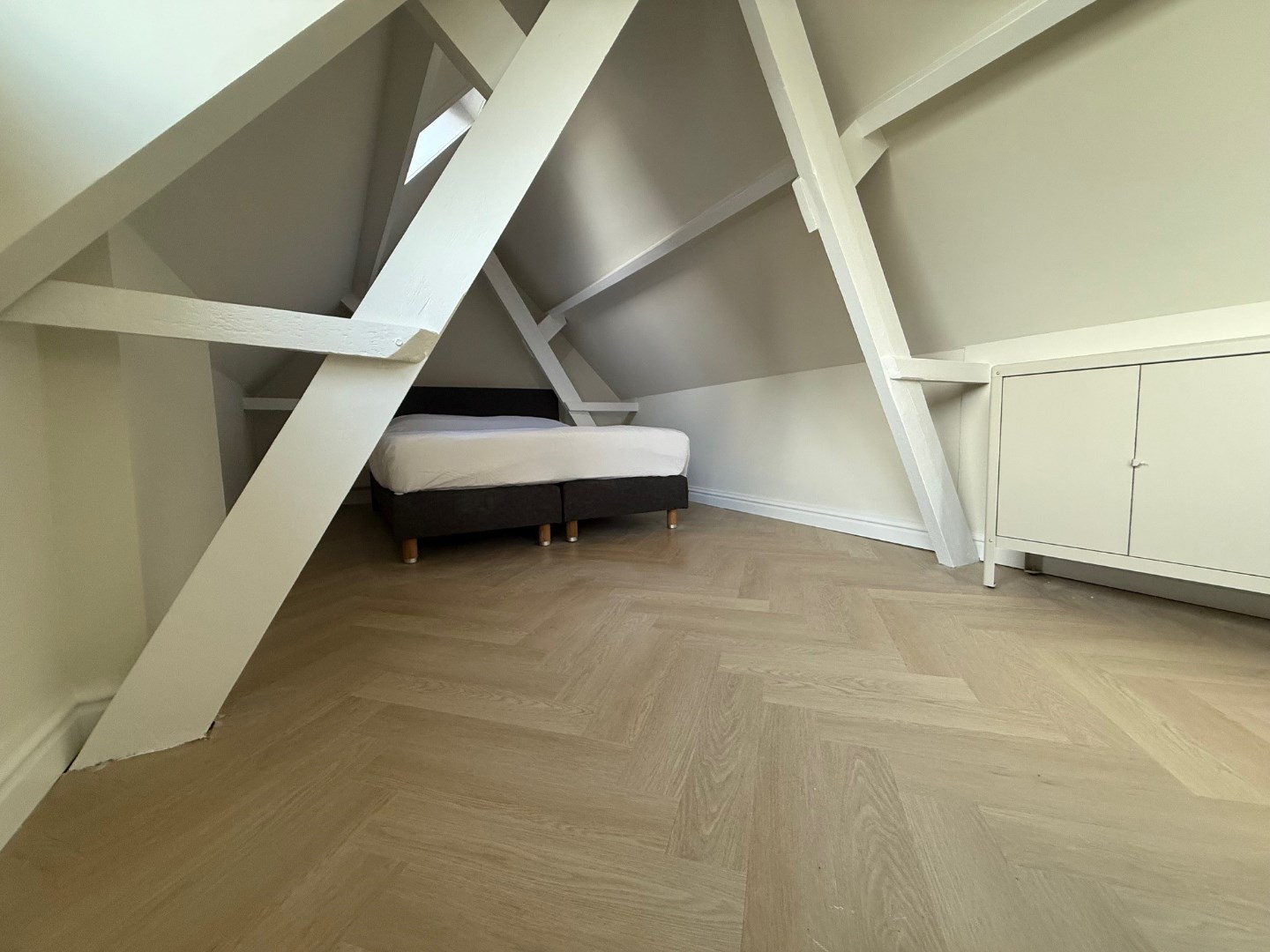 2de verdieping middels vaste trap ter bereiken leuke gezellige speelse slaapkamer met pvc-vloer, dakkapel en Velux dakraam. Aanvaarding kan per direct.