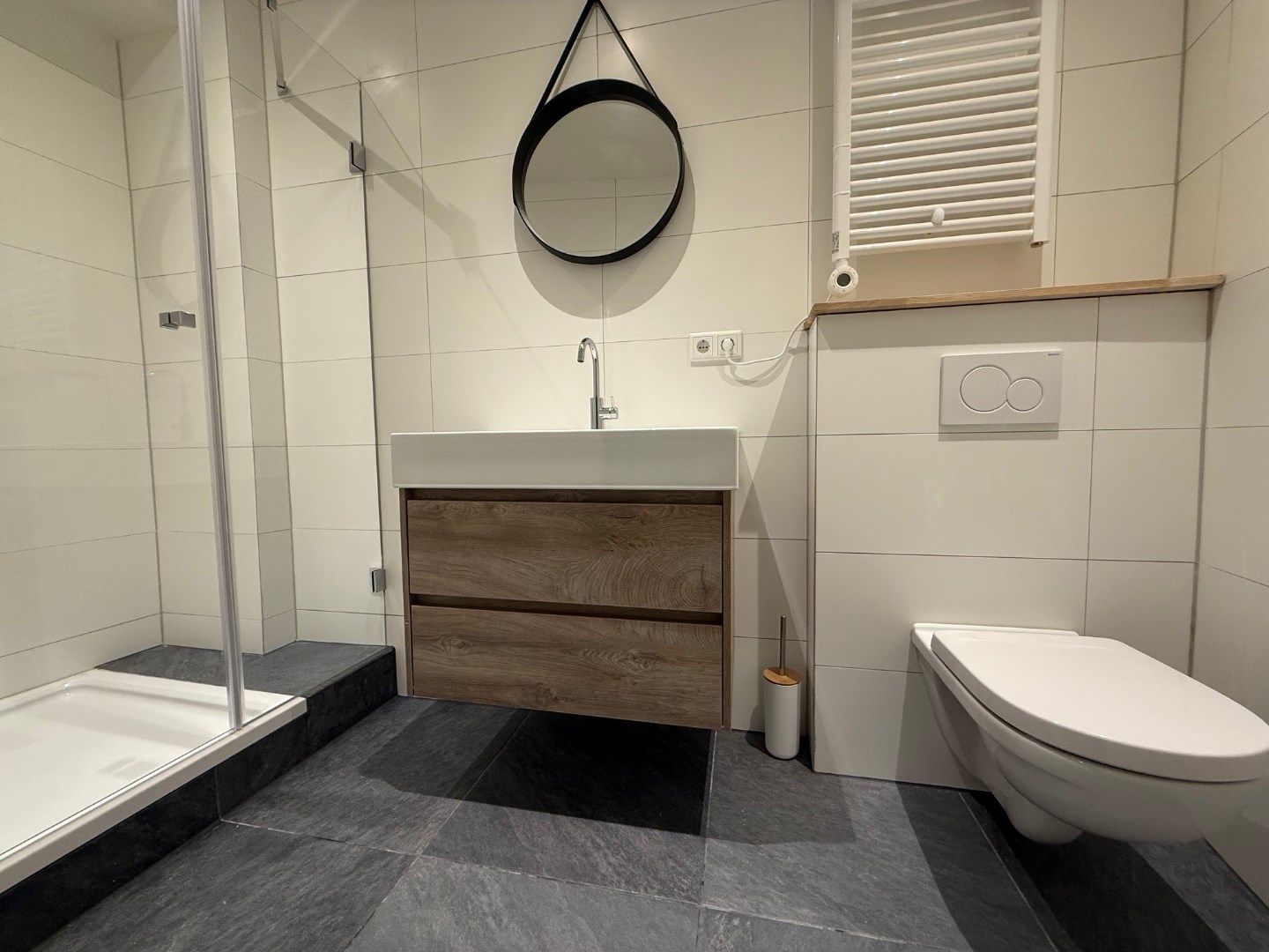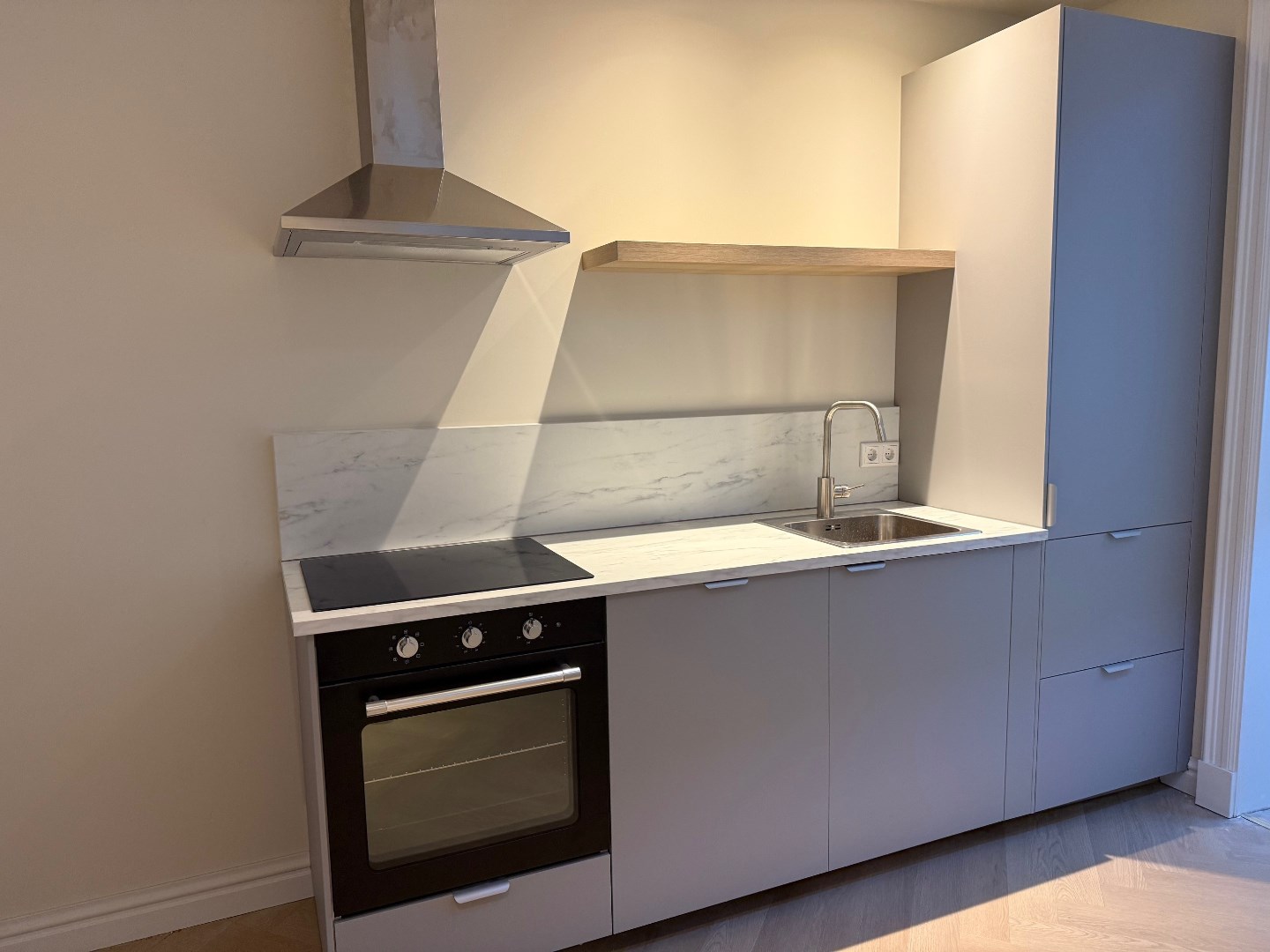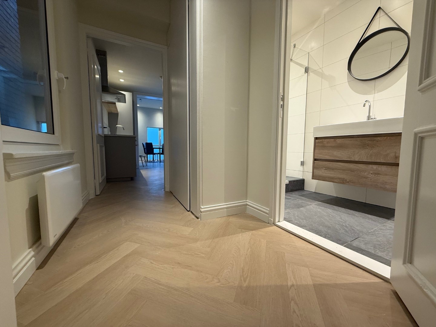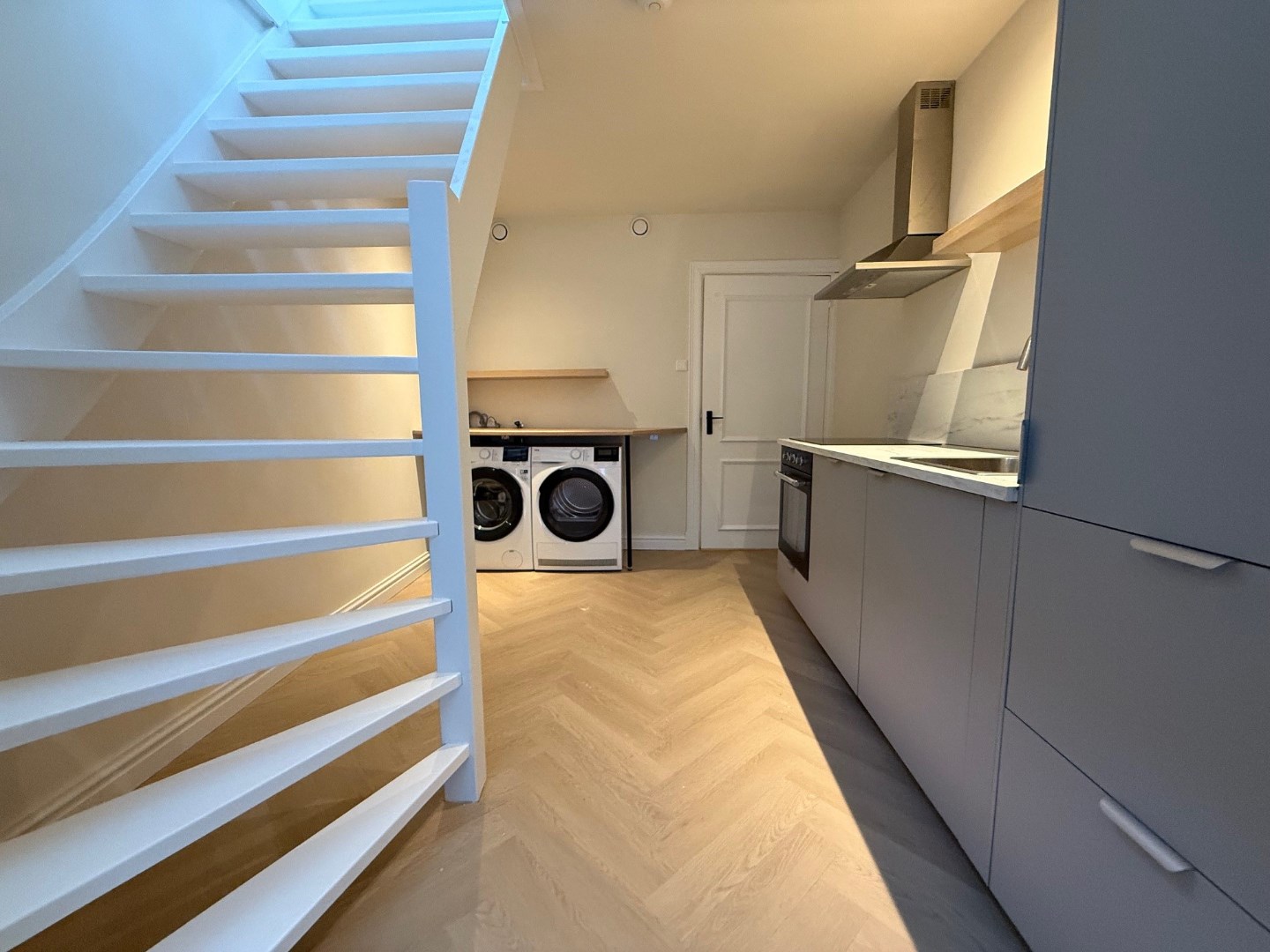 1ste verdieping centrale overloop met hieraan gelegen de voordeur van het appartement. Hal met pvc-vloer. Woonkamer met pvc-vloer, stukwerk wanden en inbouwspotjes. Open moderne keuken met inbouwapparatuur zoals: koelkast, oven, inductiekookplaat en afzuigkap. In de keuken bevinden zich ook de wasmachine en droger. Luxe betegelde badkamer met douche, wastafel met meubel, spiegel, designradiator en zwevend toilet. Aparte technische ruimte met boiler, meterkast en mechanische afzuiging.