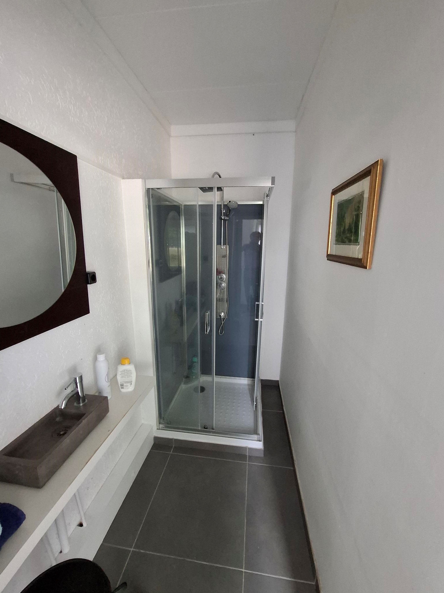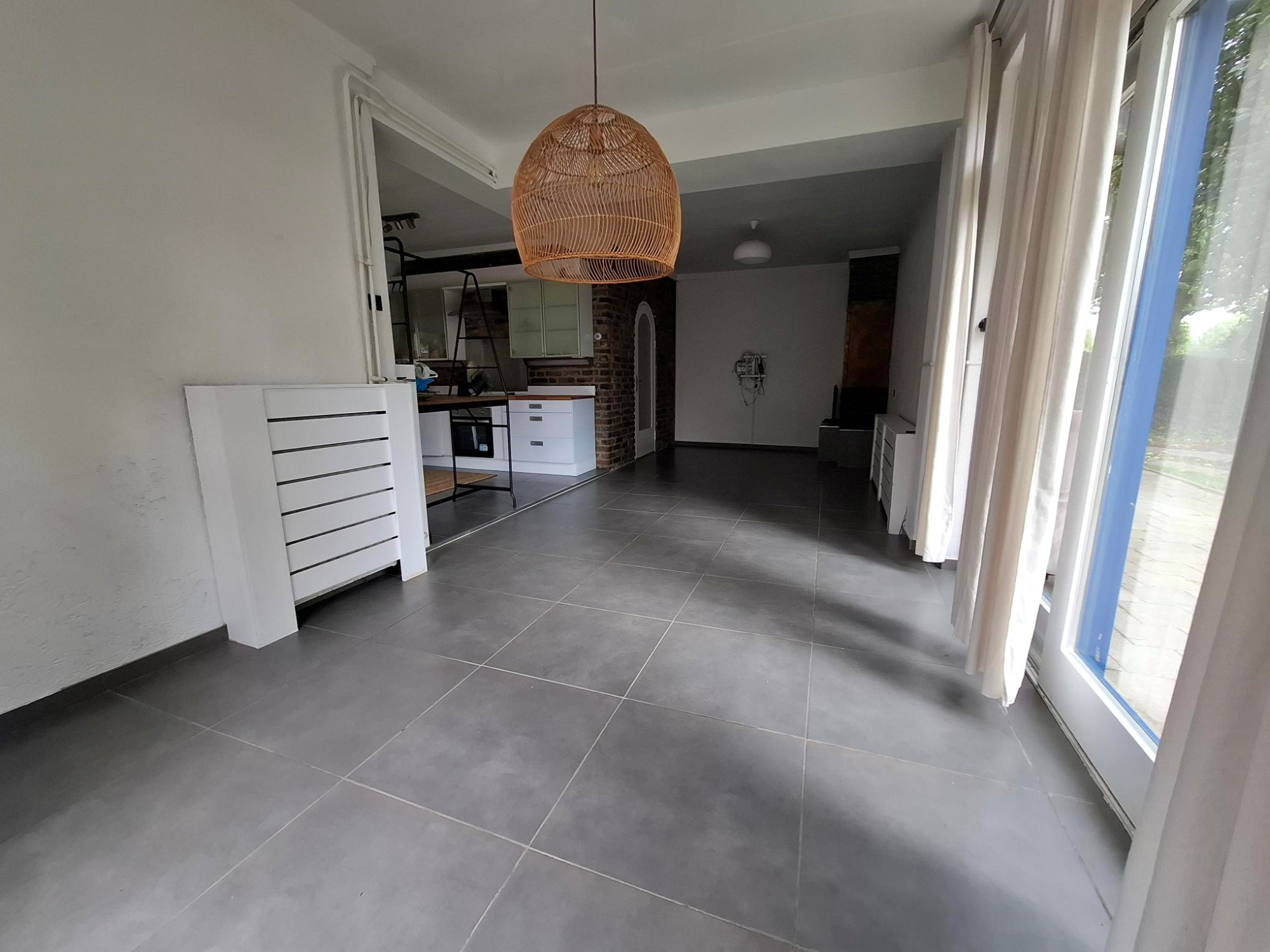 Ruime hal 4,60 x 2,00/1,45/1,10. Moderne toiletruimte. Werkkamer/slaapkamer 4,05 x 2,50/3,50. Badkamer met douche en wastafel. Woonkamer 8,50 x 3,05 met plavuizenvloer en schuifpui naar grote tuin. Open keuken 3,20 x 2,90 met witte keukeninstallatie in hoekopstelling voorzien van inbouwapparatuur.