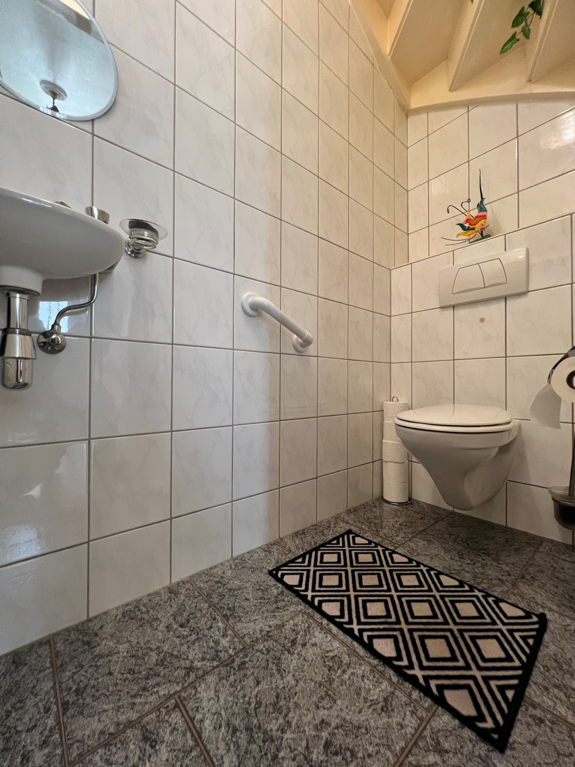 Entrance / spacious hall with toilet and meter cupboard. Toilet room with toilet and sink.