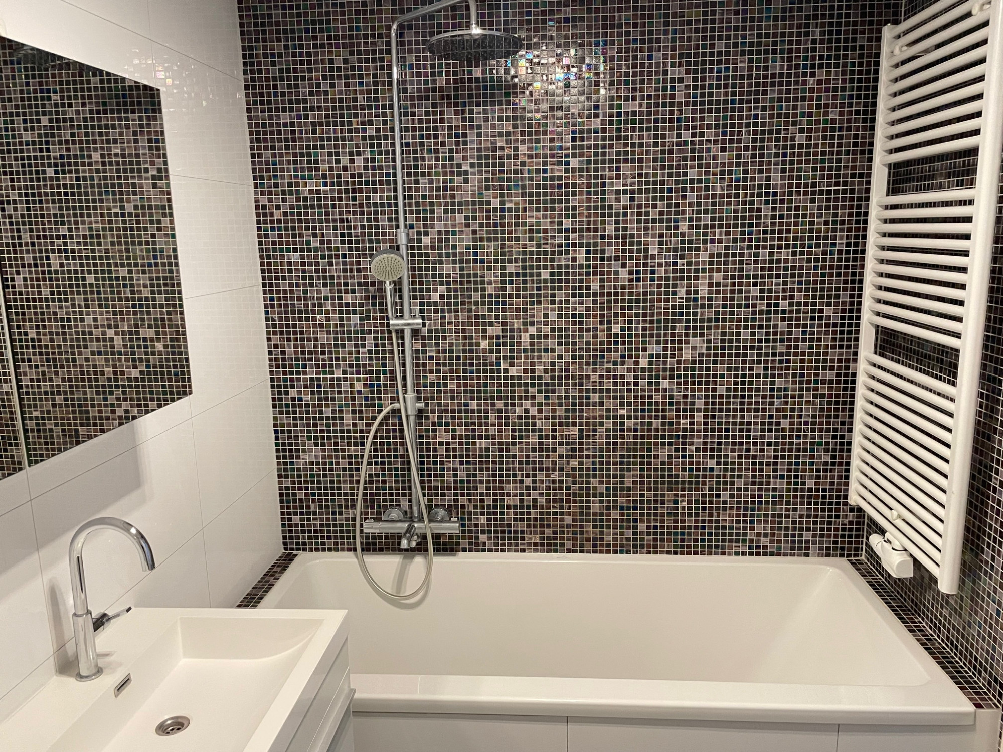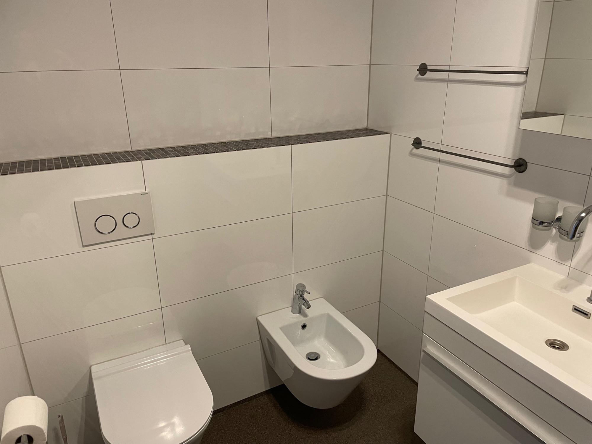 Luxe badkamer met bad voorzien van regendouche, 2e toilet, bidet en badmeubel met dubbele wastafel.