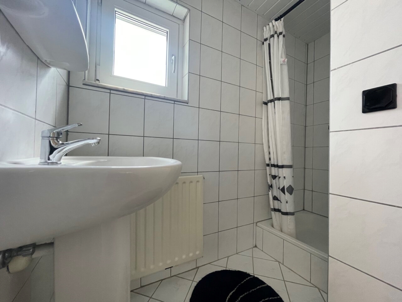 Fully tiled bathroom (2.25 x 1.10/0.80 m) equipped with a sink and shower.