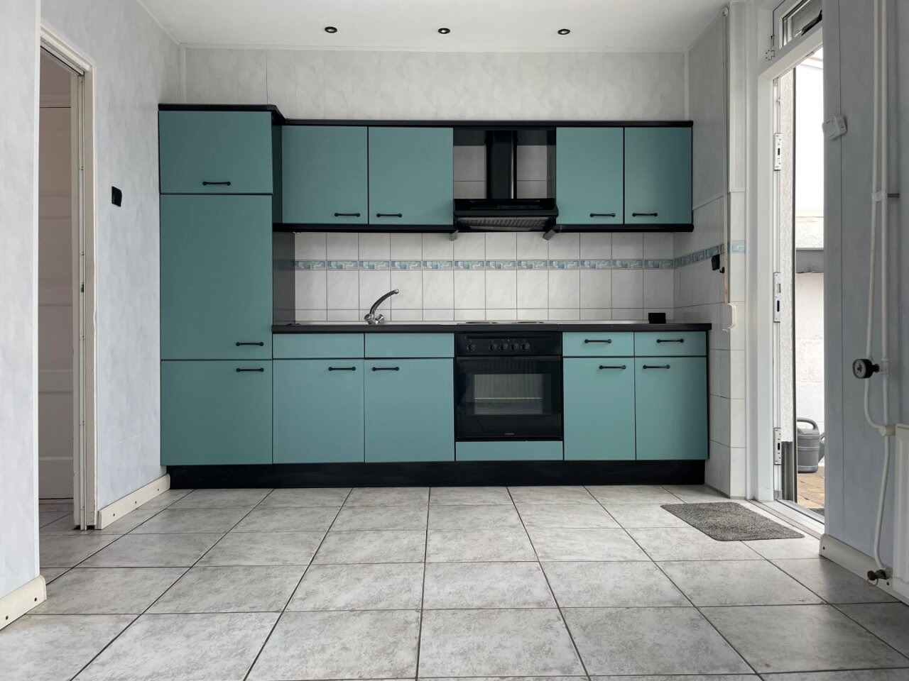 Open-plan kitchen (3.00 x 2.35 m) with tiled flooring and a neat layout featuring the following built-in appliances: refrigerator, oven, 4-burner electric cooktop, and extractor hood. A door leads to the back garden.