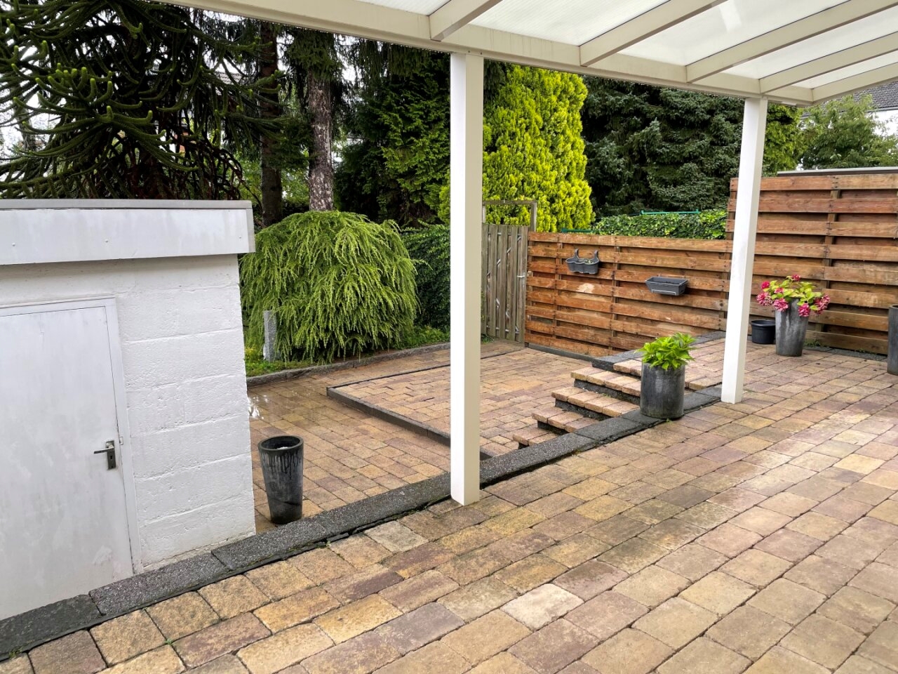 Spacious, fully enclosed back garden (18 x 11/8.5 m). The back garden is beautifully landscaped and features a large paved patio (8.5 x 3.75 m) with a covered patio (6.5 x 3.5 m), a stone shed (2.50 x 2.50 m), and rear access.