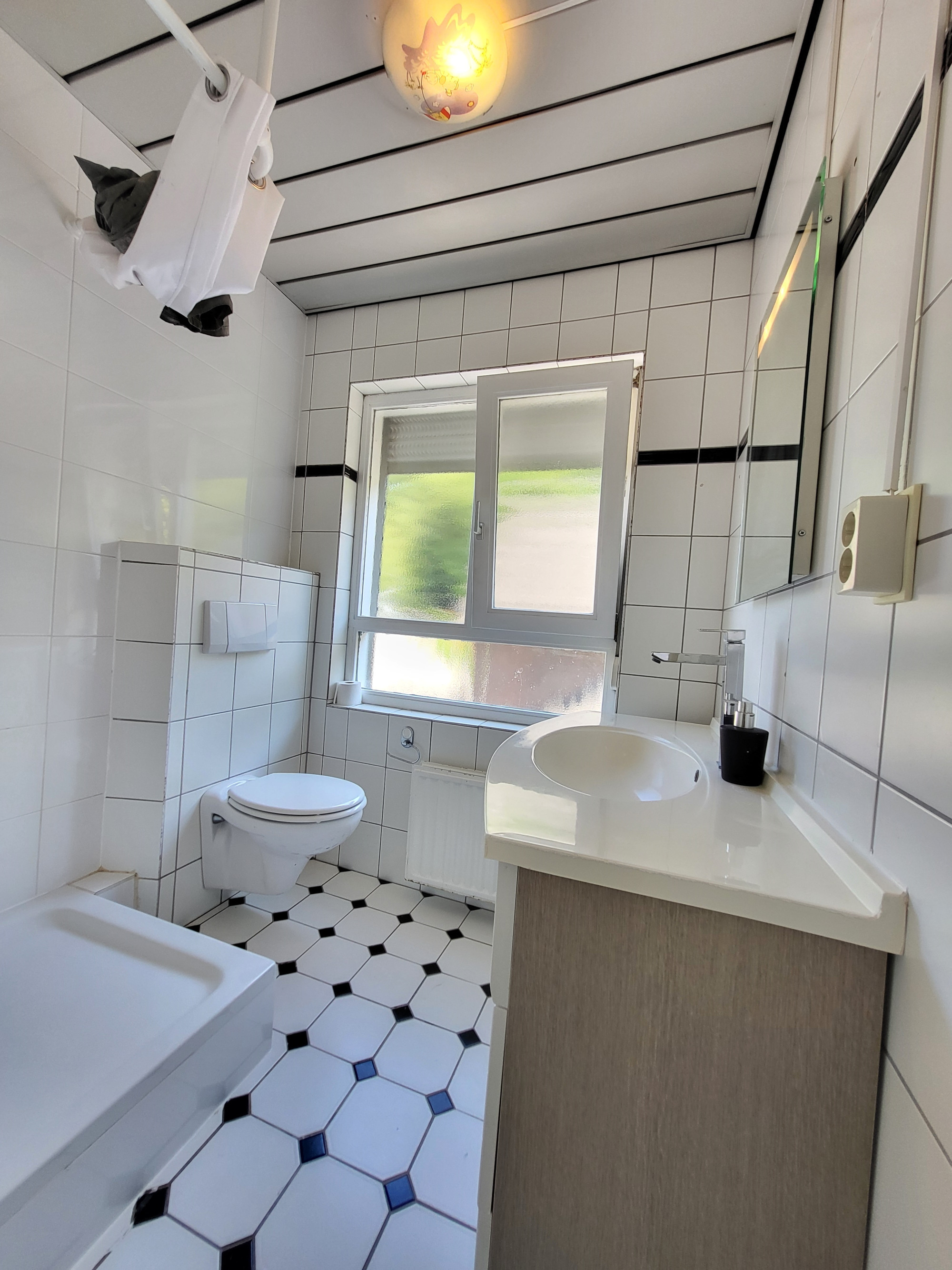 Landing with access to the 3 bedrooms and bathroom. The bedrooms (15m2, 12m2 and 6 m2) are all equipped with a laminate floor and shutters. The compact bathroom (3m2) is equipped with a shower, 2nd toilet and bathroom furniture with fixed washbasin.