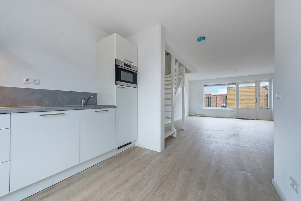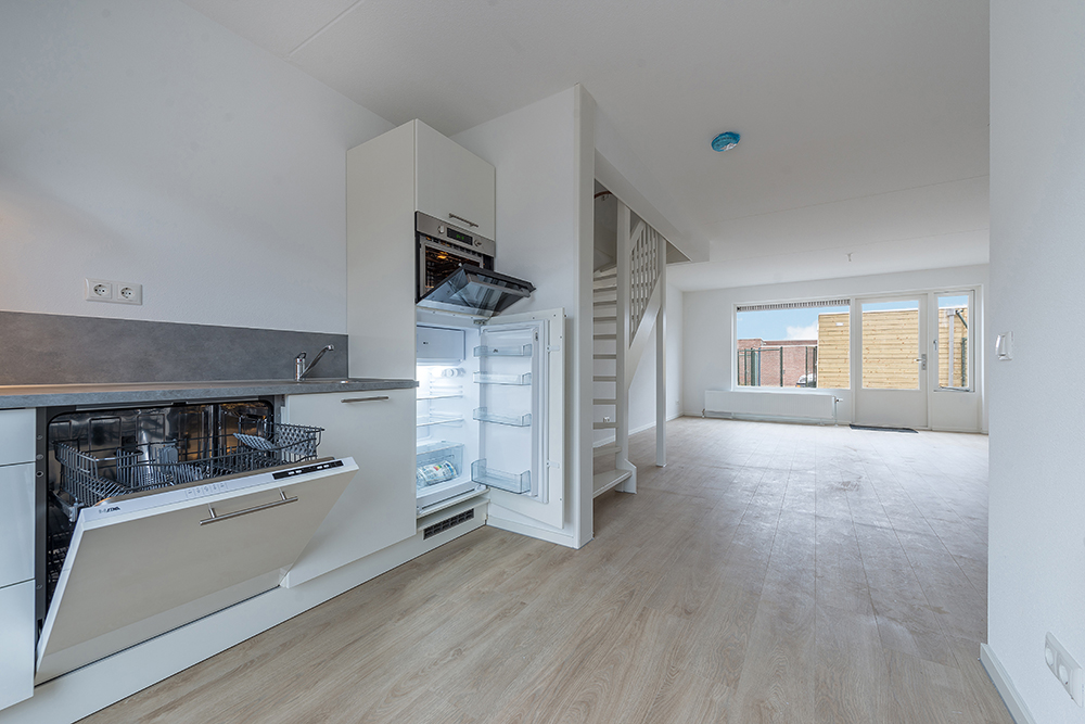 Woonkamer (6.80 x 5.15 m) met open keuken (2.65 x 2.65 m) eveneens voorzien van PVC vloer en luxe keukeninstallatie met diverse onder- en bovenkasten, inbouwapparatuur te weten: 4-pits keramische kookplaat, afzuigkap, combimagnetron, koelkast en vaatwasser.