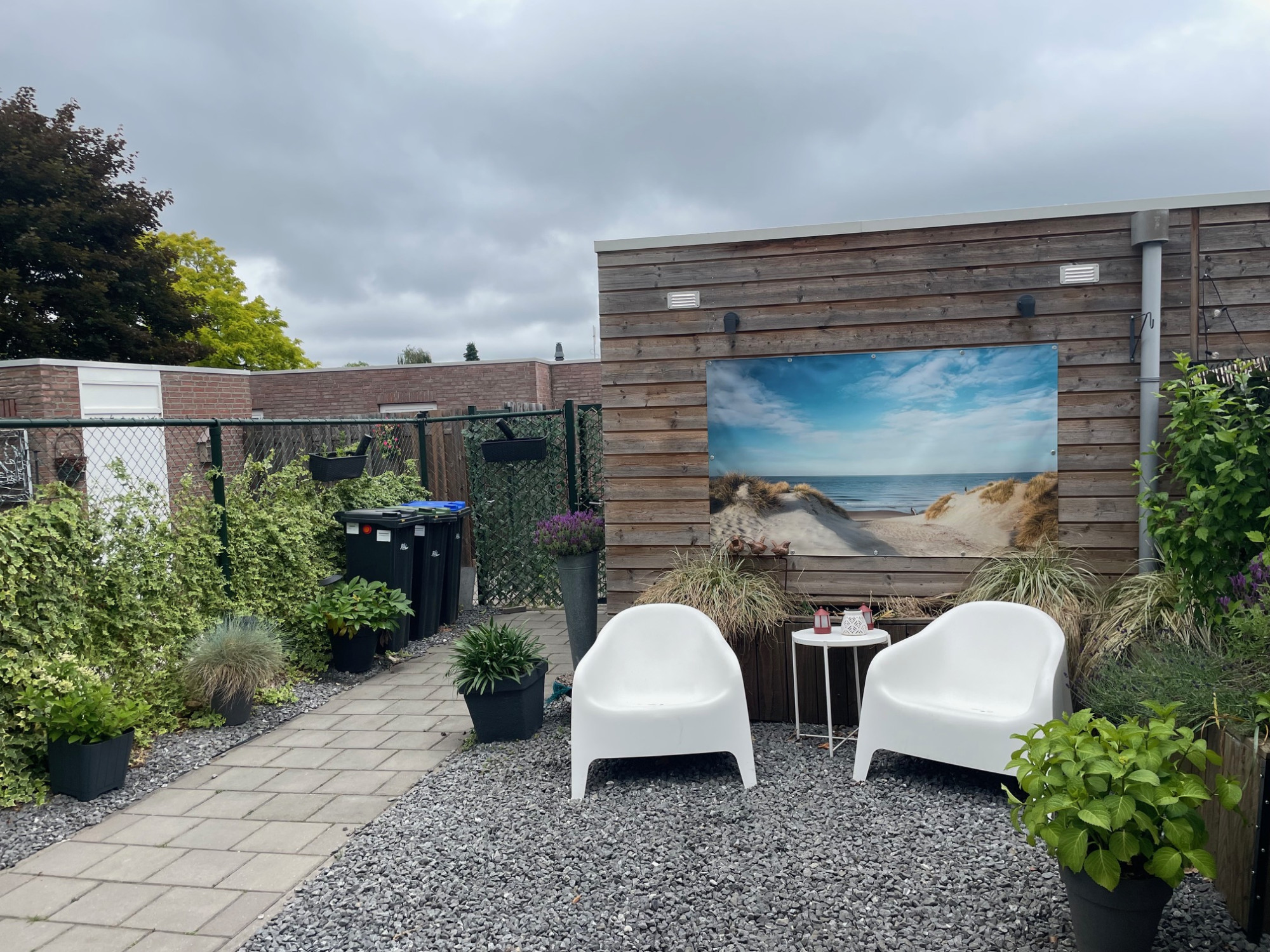 Vanuit de woonkamer toegang tot de omsloten tuin met terras, buitenberging (3.00 x 3.00 m) en achteringang.