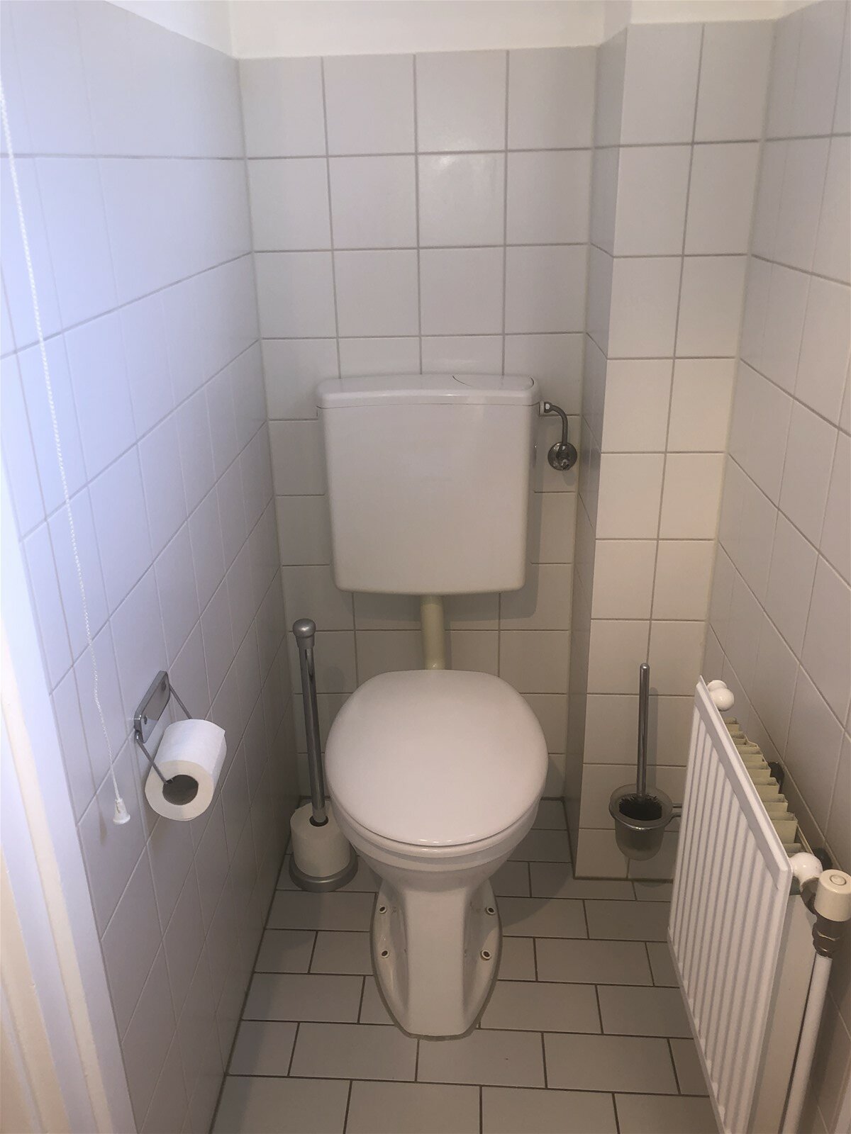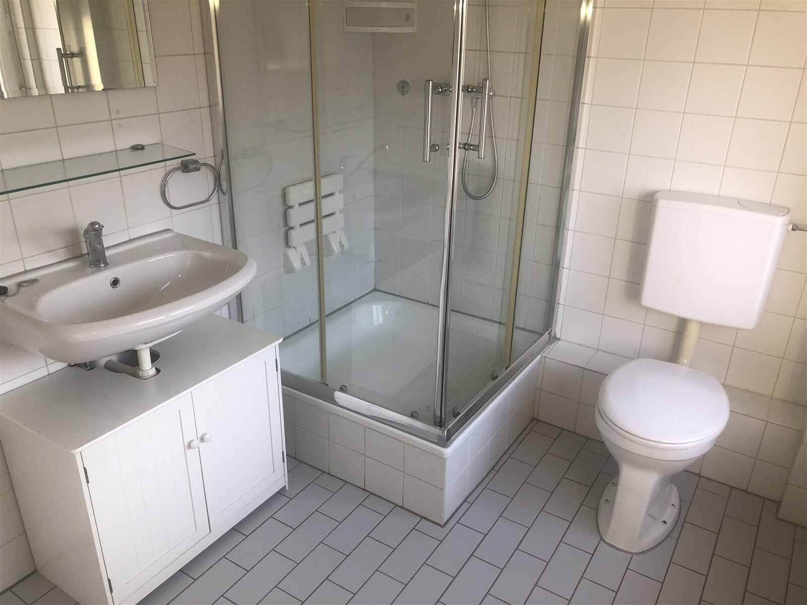Overloop met toegang naar drie slaapkamers en een berging en de badkamer. Badkamer (5,5m2) met douche, tweede toilet en wastafel.