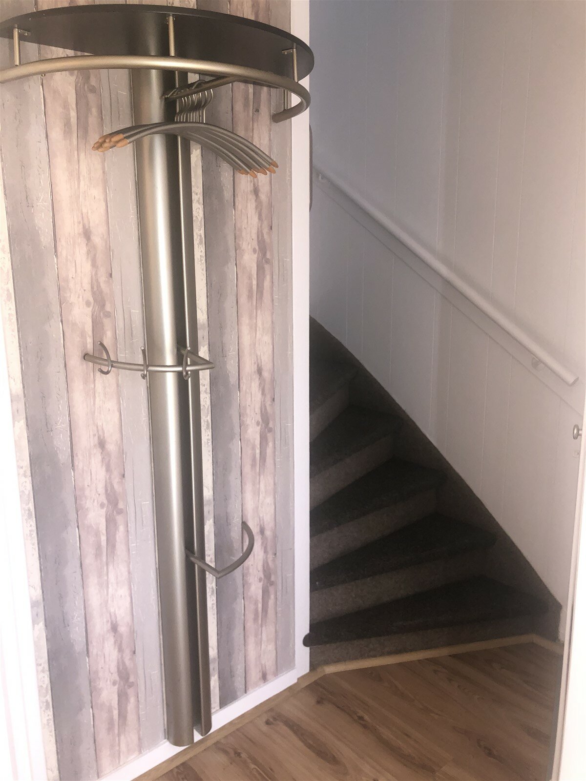 Entree met verdiepingstrap, meterkast, toilet en toegang naar de keuken en woonkamer.