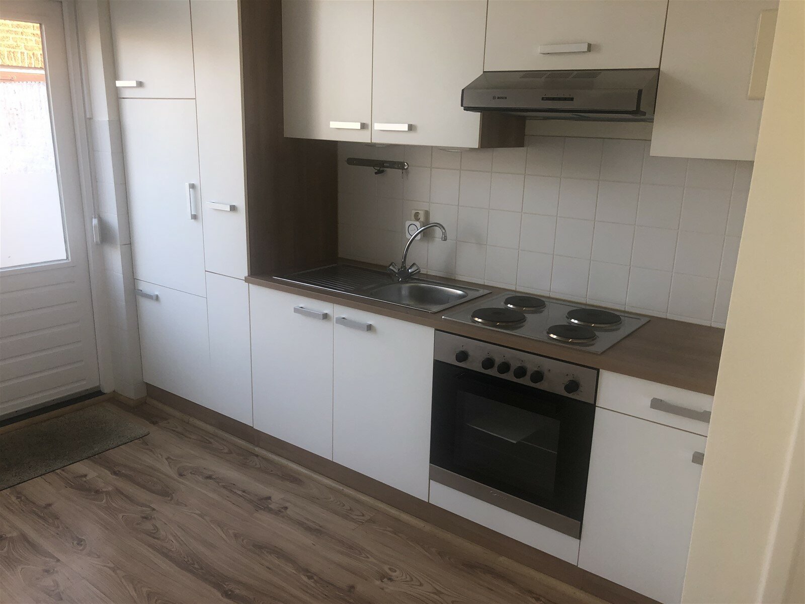 Gesloten keuken(8,5m2) met een net keukenblok. Toegang naar de tuin en de kelder. Woonkamer(22m2) met laminaatvloer.