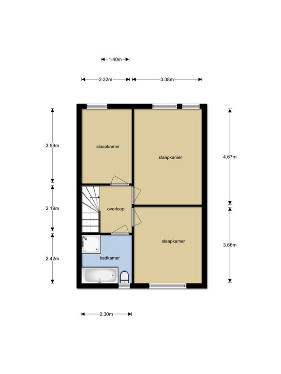 - Overloop met toegang tot de vertrekken en vaste trap naar de 2e verdieping.