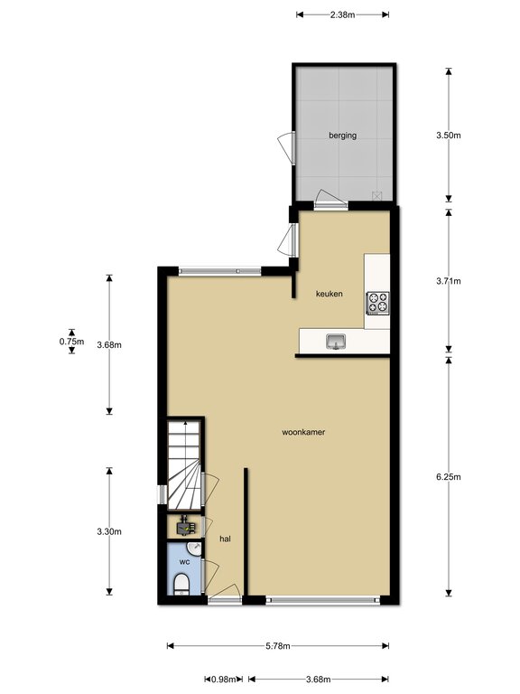 - Keuken van circa 8 m² met openslaande deur naar de achtertuin en toegang tot de aangrenzende berging.