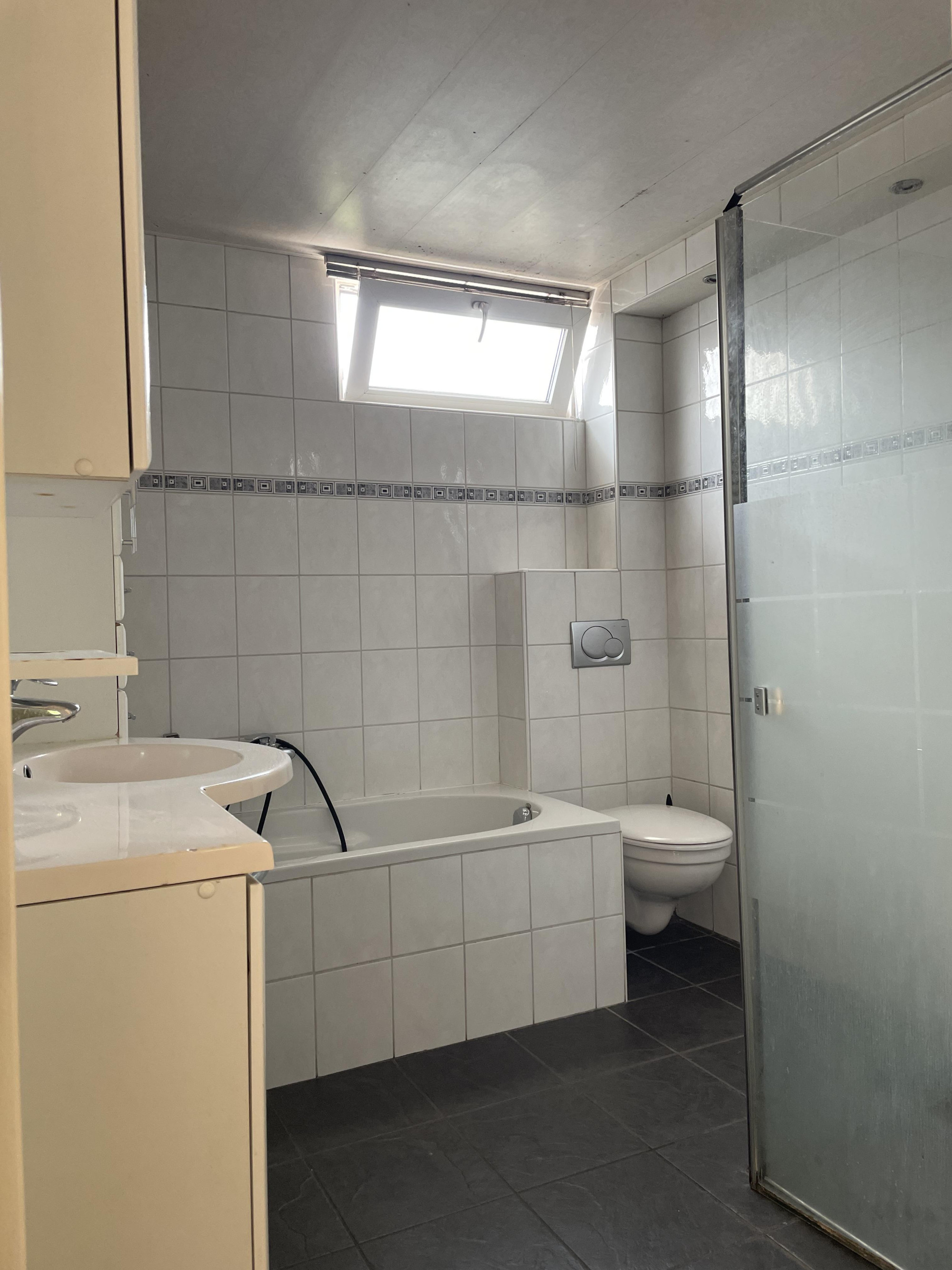 - Betegelde badkamer van circa 6 m² met een wastafel, douche, ligbad en wandcloset.