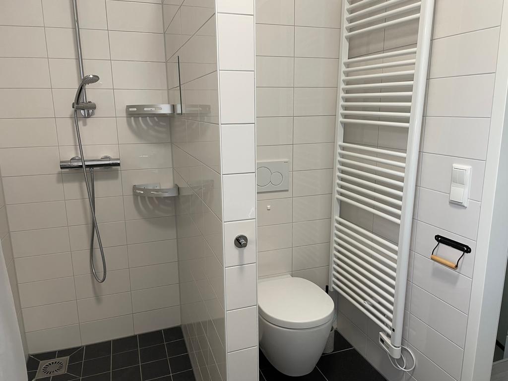 Betegelde toiletruimte voorzien van wandcloset en fonteintje.