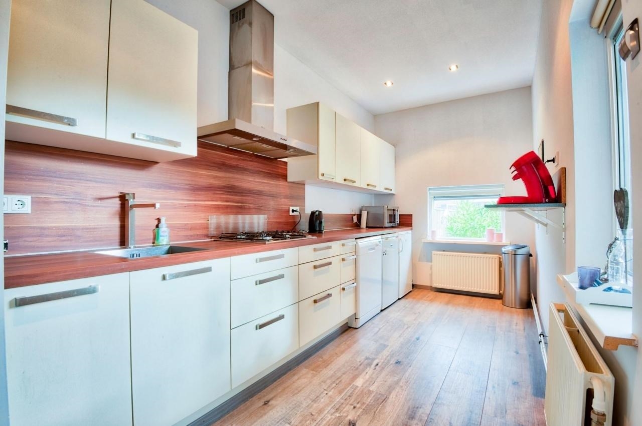The closed kitchen with a laminate floor (approx. 11m²) has a spacious kitchen unit which is equipped with an oven, 4 burner gas stove, built-in refrigerator and dishwasher. The connection for the washing machine is also located here. The fully paved backyard with garden shed can be reached from the kitchen. There is also a free back entrance.