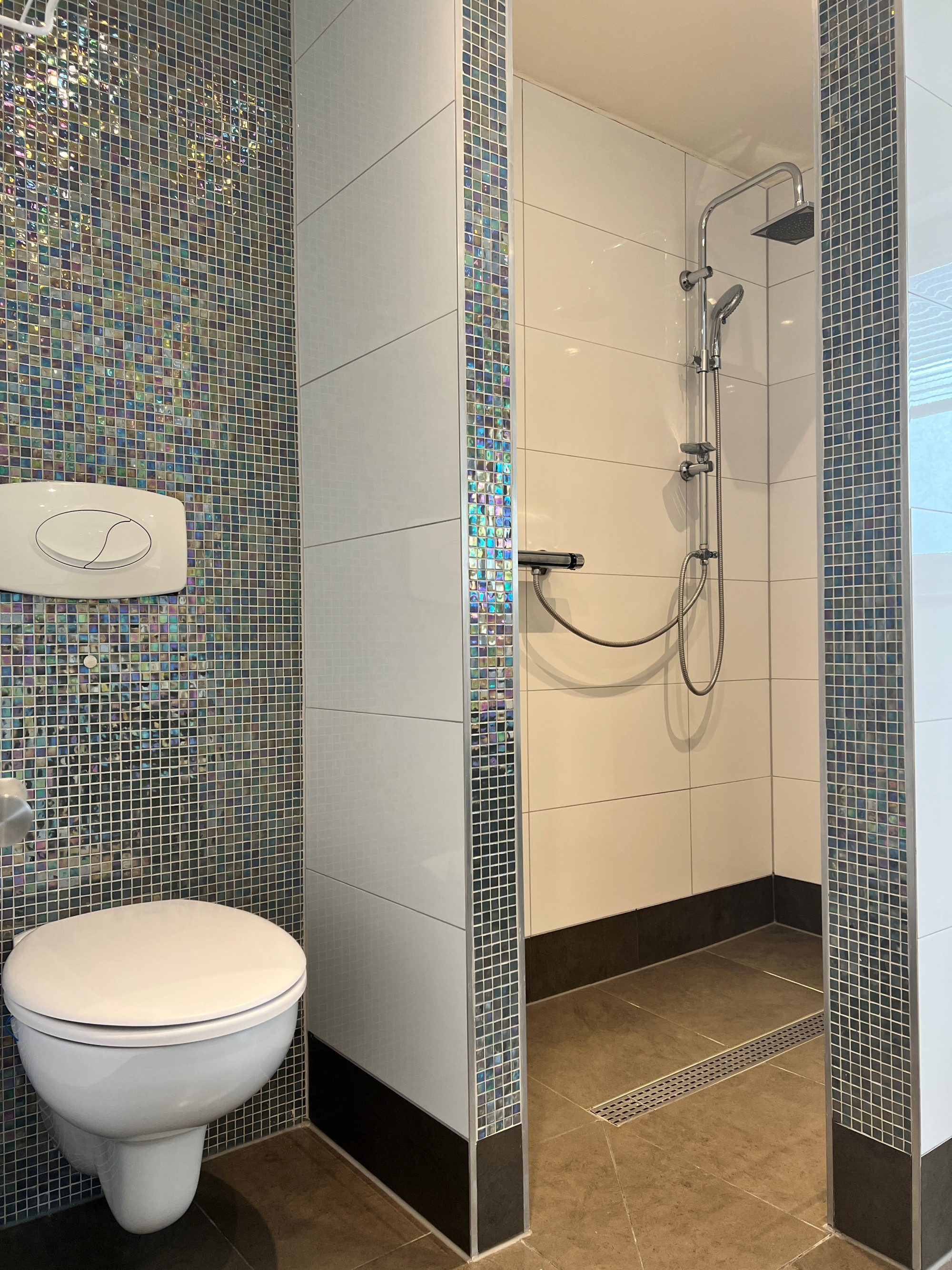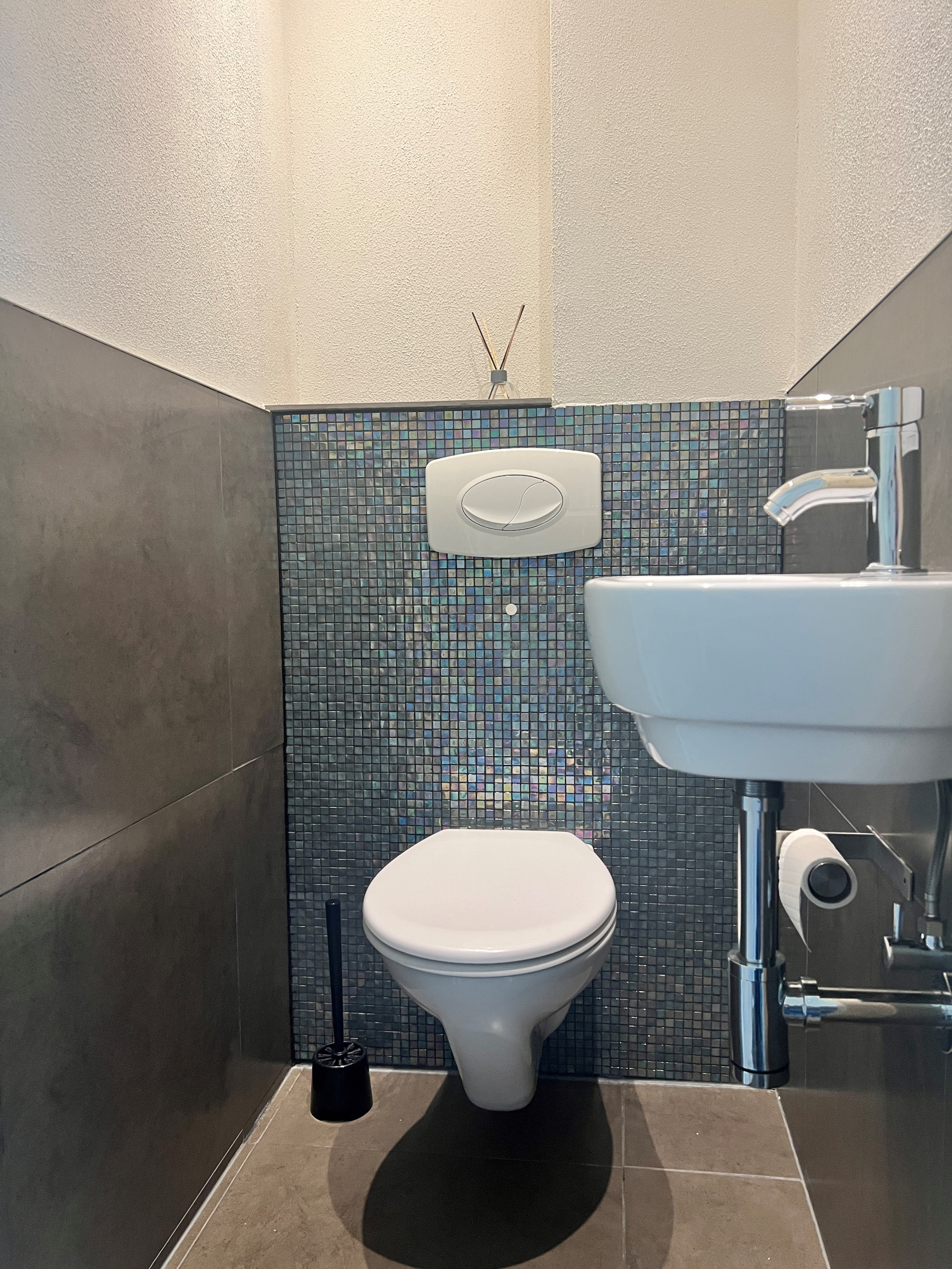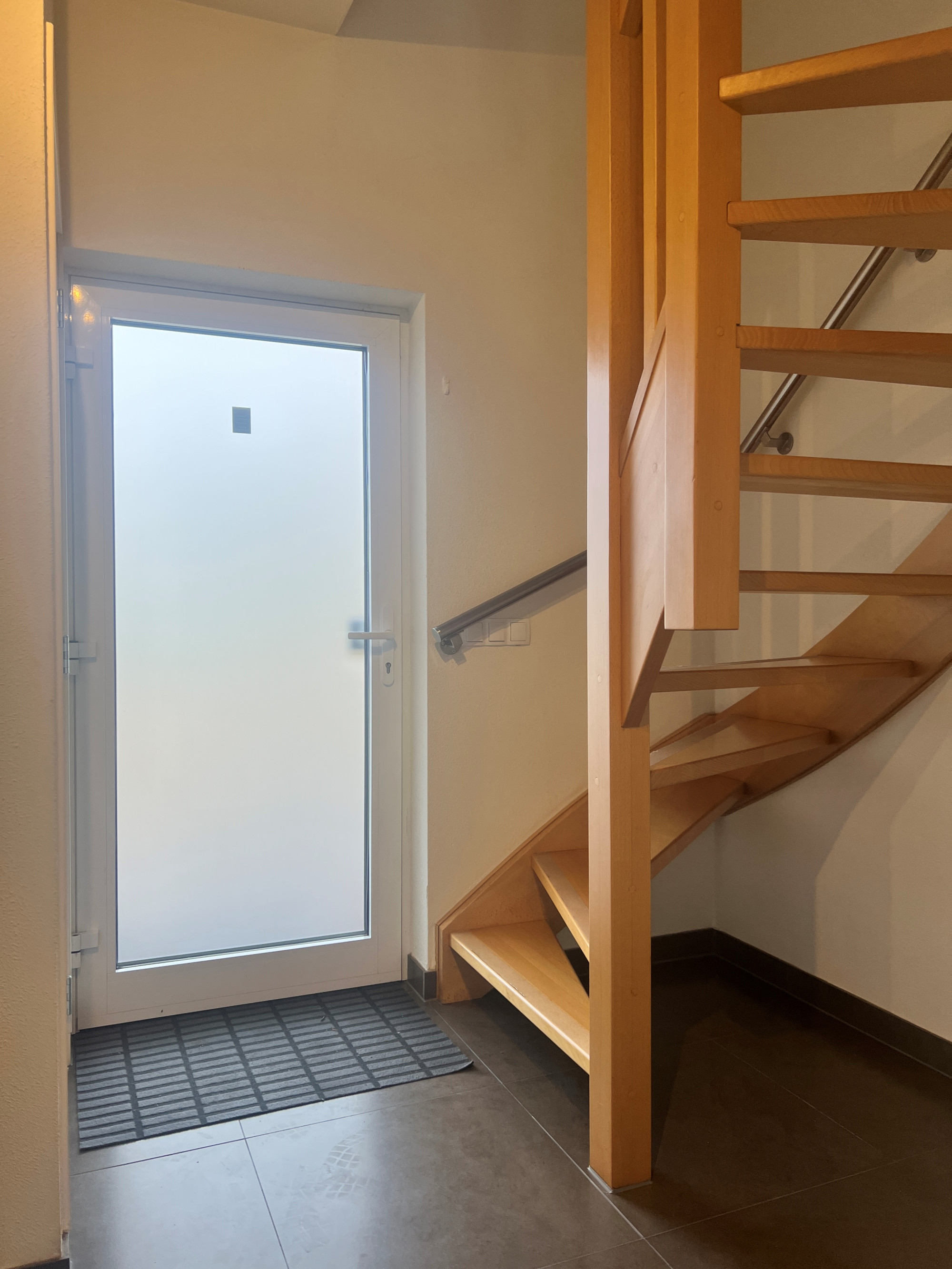 Ground floor: covered entrance, hall, meter cupboard, modern toilet with wall closet and designer fountain, staircase with wardrobe underneath and access to the living room/kitchen.