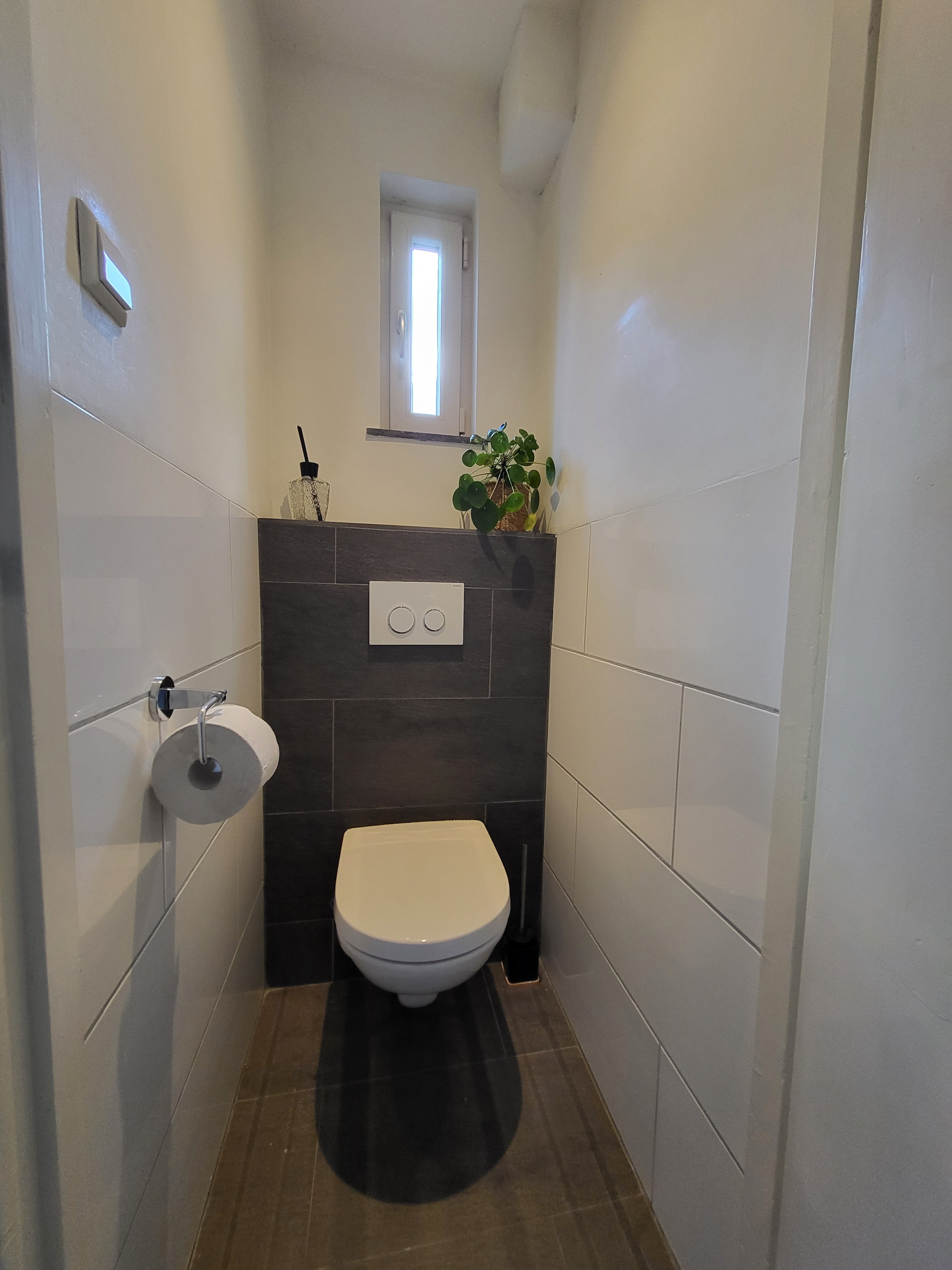 Entrance/spacious hall with toilet and meter cupboard. Toilet room with toilet and sink.