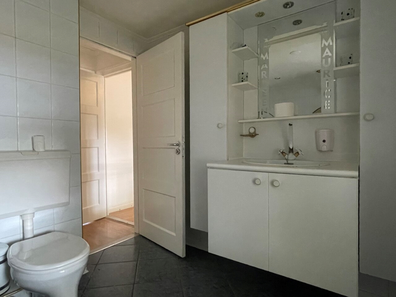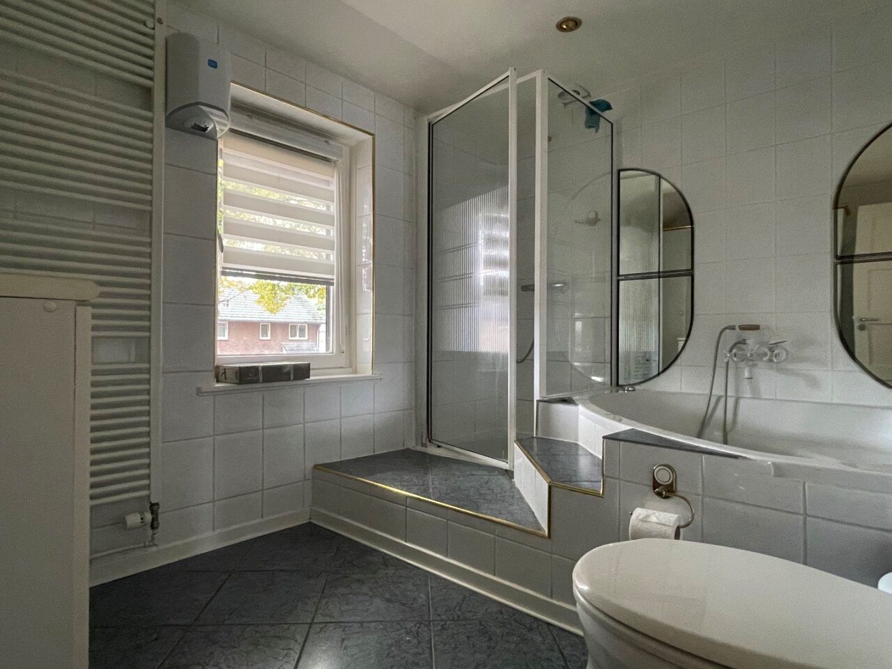 Fully tiled bathroom (3.50 x 2.50 m) with a sink with casing, shower, bath and a 2nd toilet.