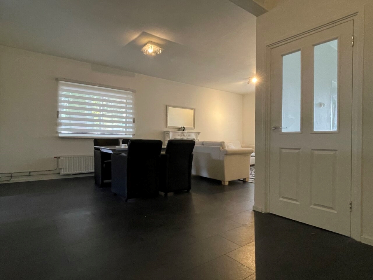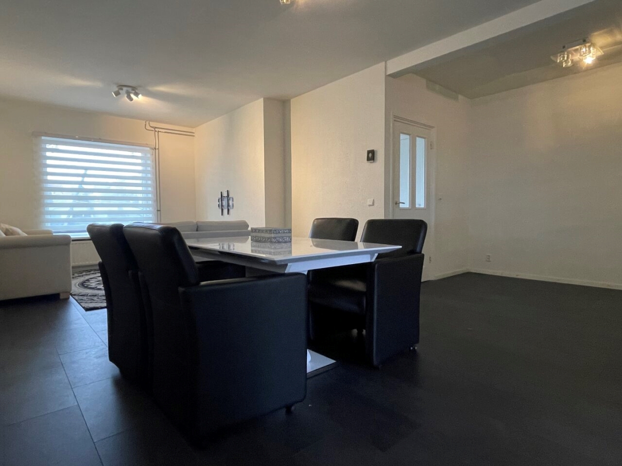 Spacious L-shaped living room (7.40 x 5.80/3.70 m) with anthracite laminate floor.