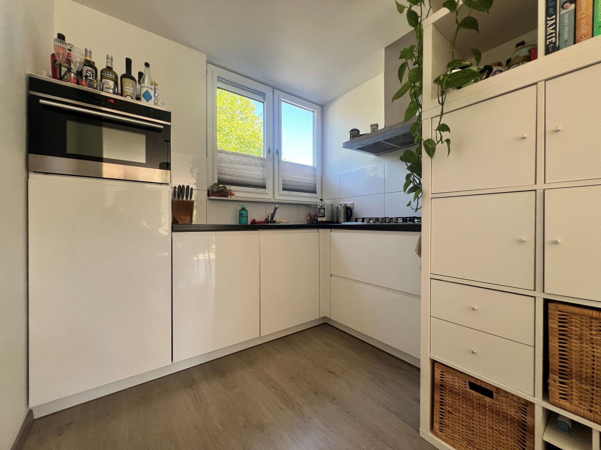 Attractive living room with double doors to the enclosed garden and connected to the modern semi-open kitchen with a combi oven, dishwasher, refrigerator, gas cooker and extractor.
