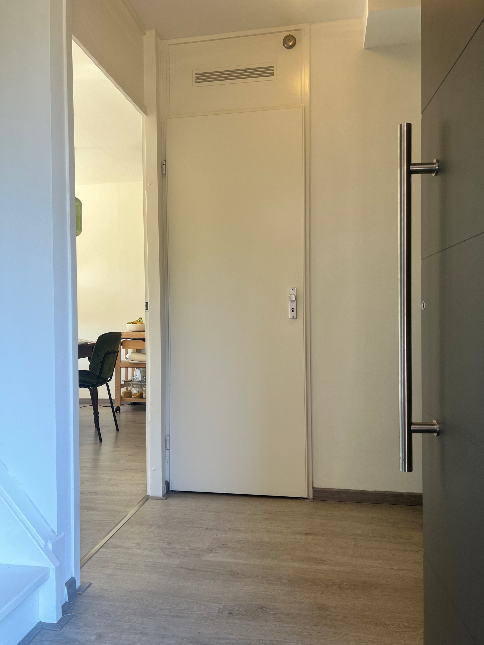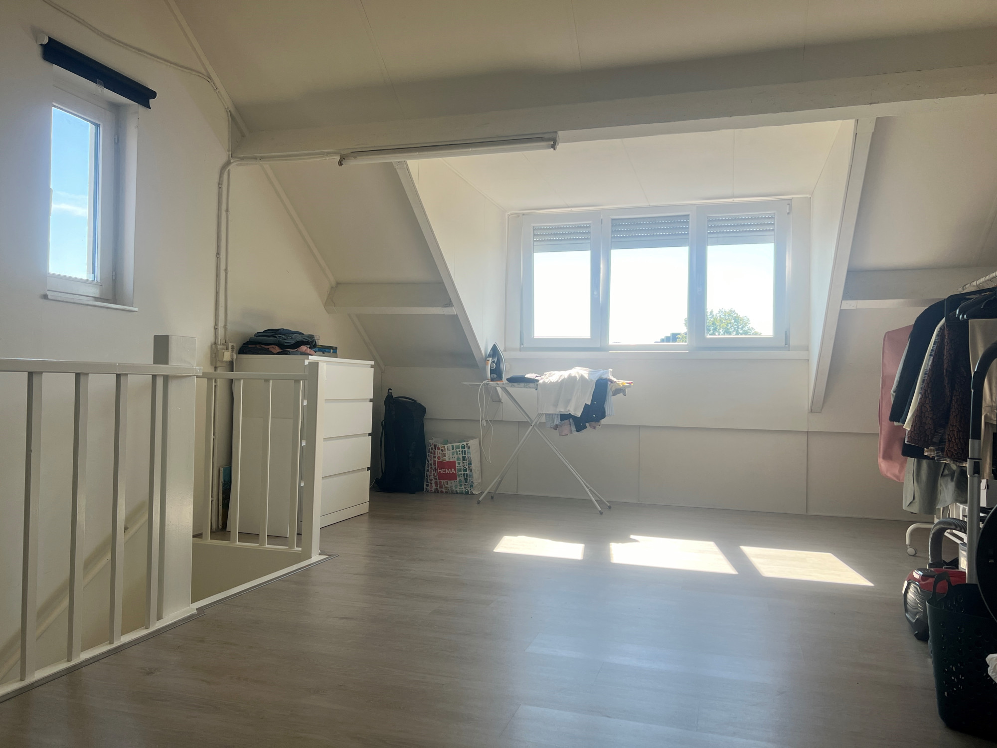 Fixed stairs to spacious attic room, where the washing machine connection and central heating system are located.
