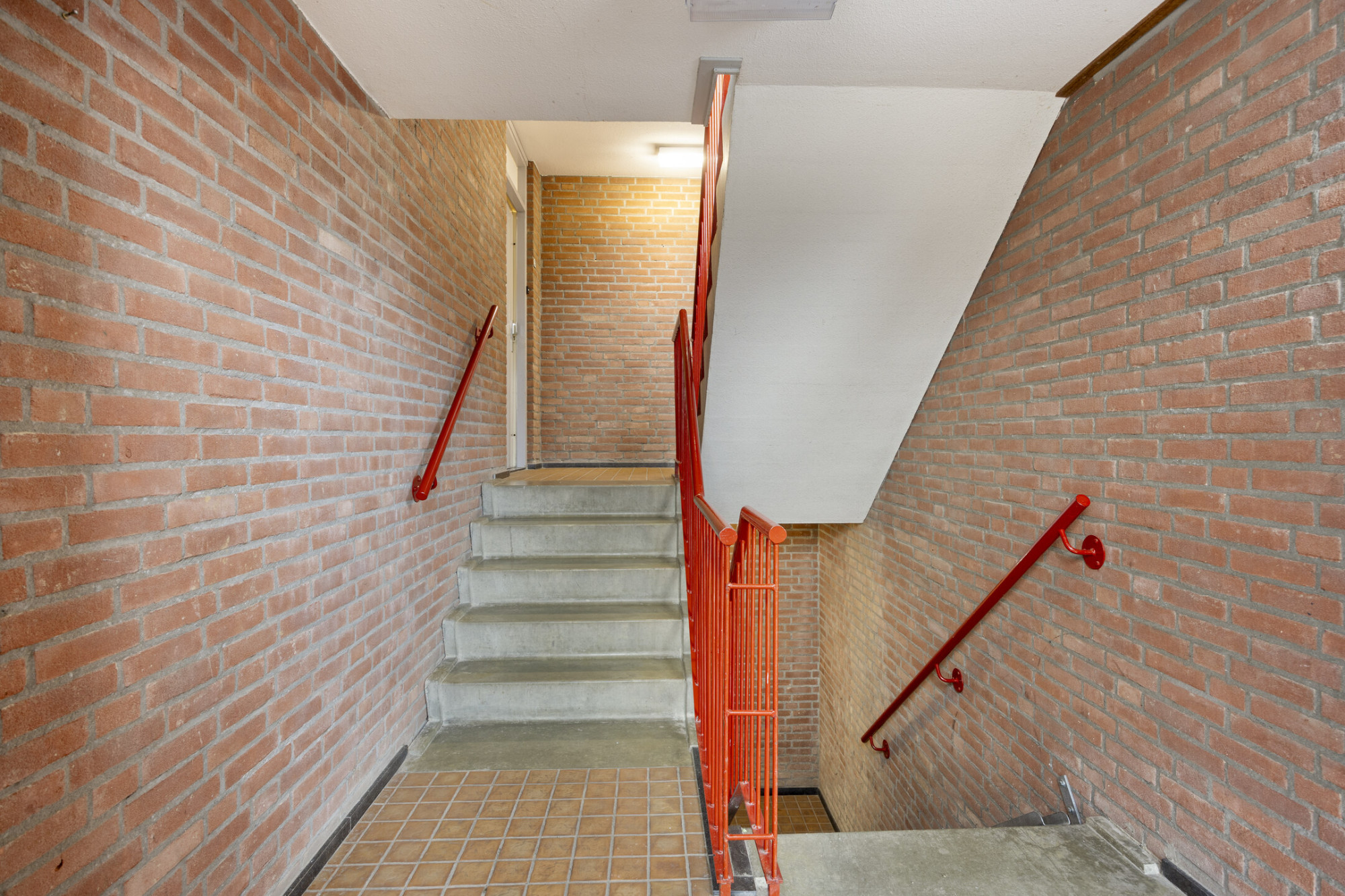 Centrale hal met bellentableau en brievenbussen. Naast het complex ligt er een parkeerterrein.