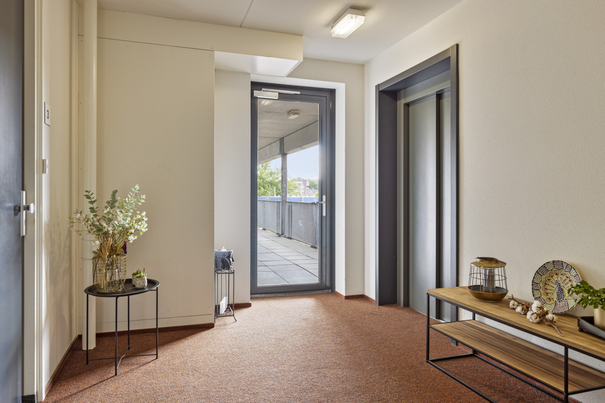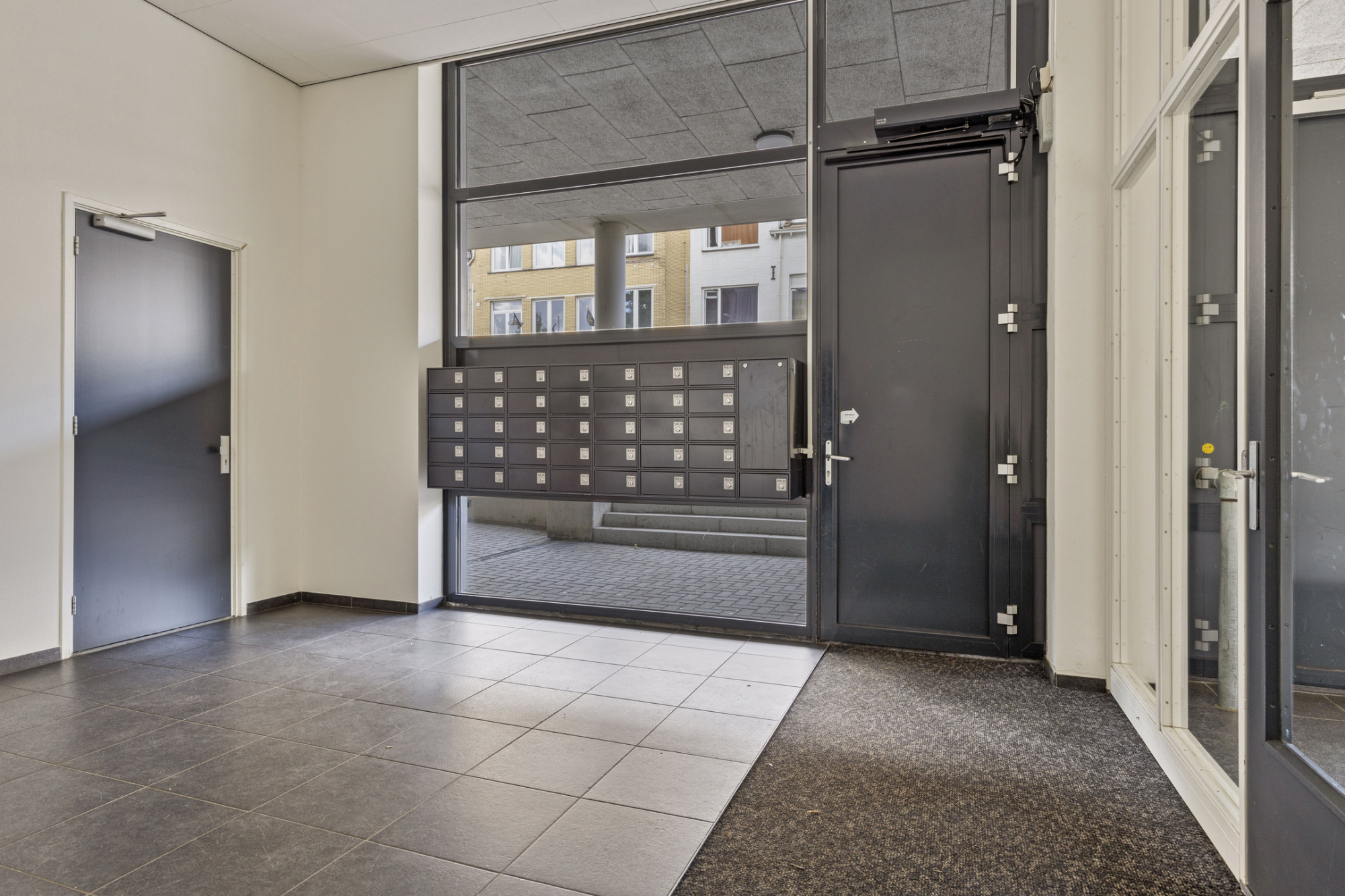 Overdekte entree met bellentableau. Inkomhal met liftinstallatie en trappenhuis.