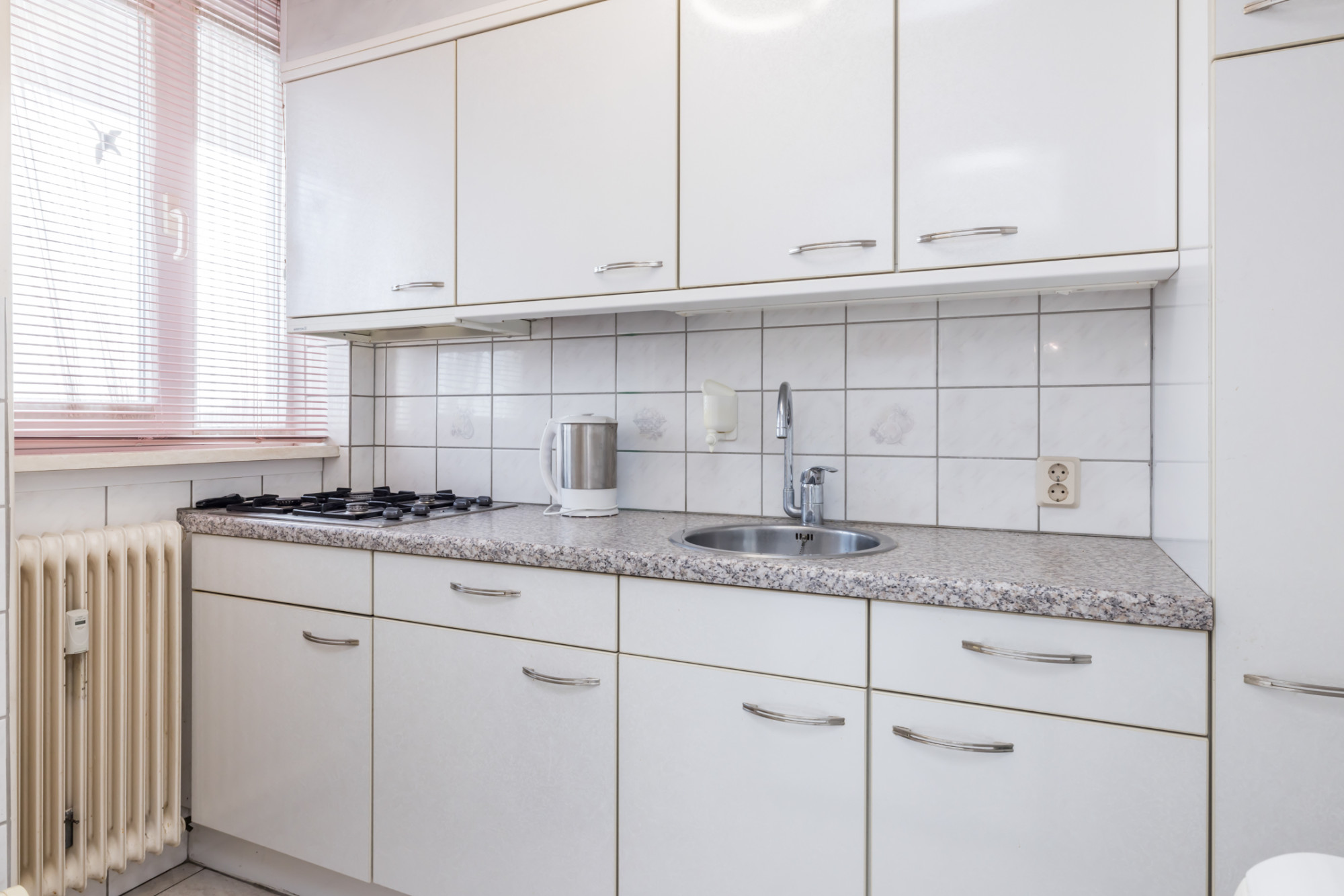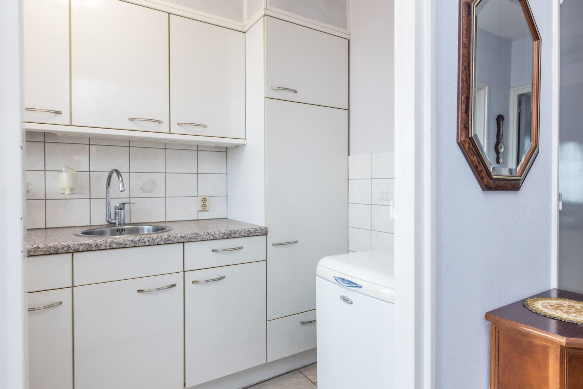 Een keukenruimte met inbouwkeuken voorzien van 4 pits gasfornuis / een afzuigkap / wasbak / veel bergruimte, de witgoedaansluiting voor de wasmachine en een geiser ten behoeve van de warmwatervoorziening (eigendom).