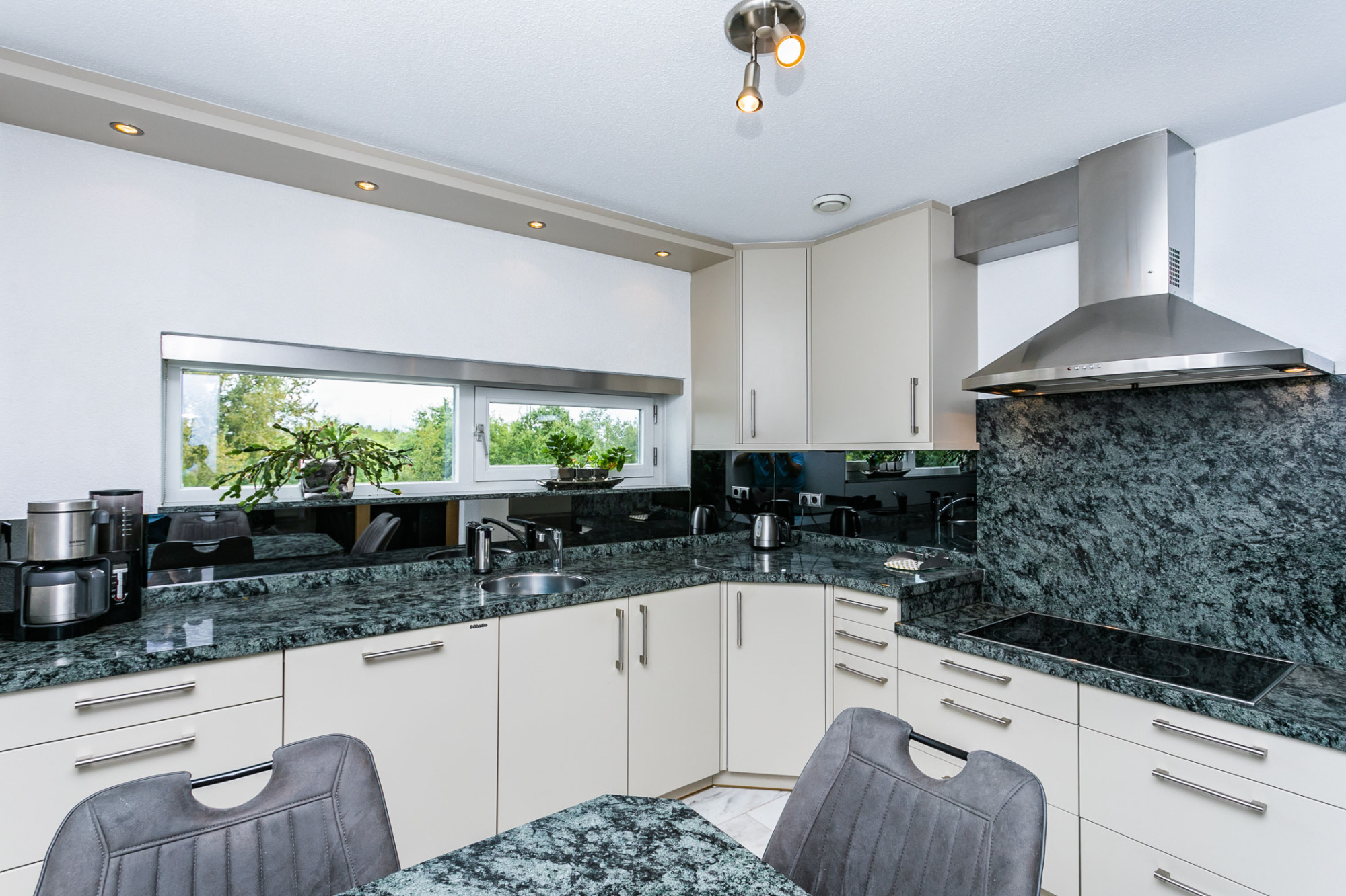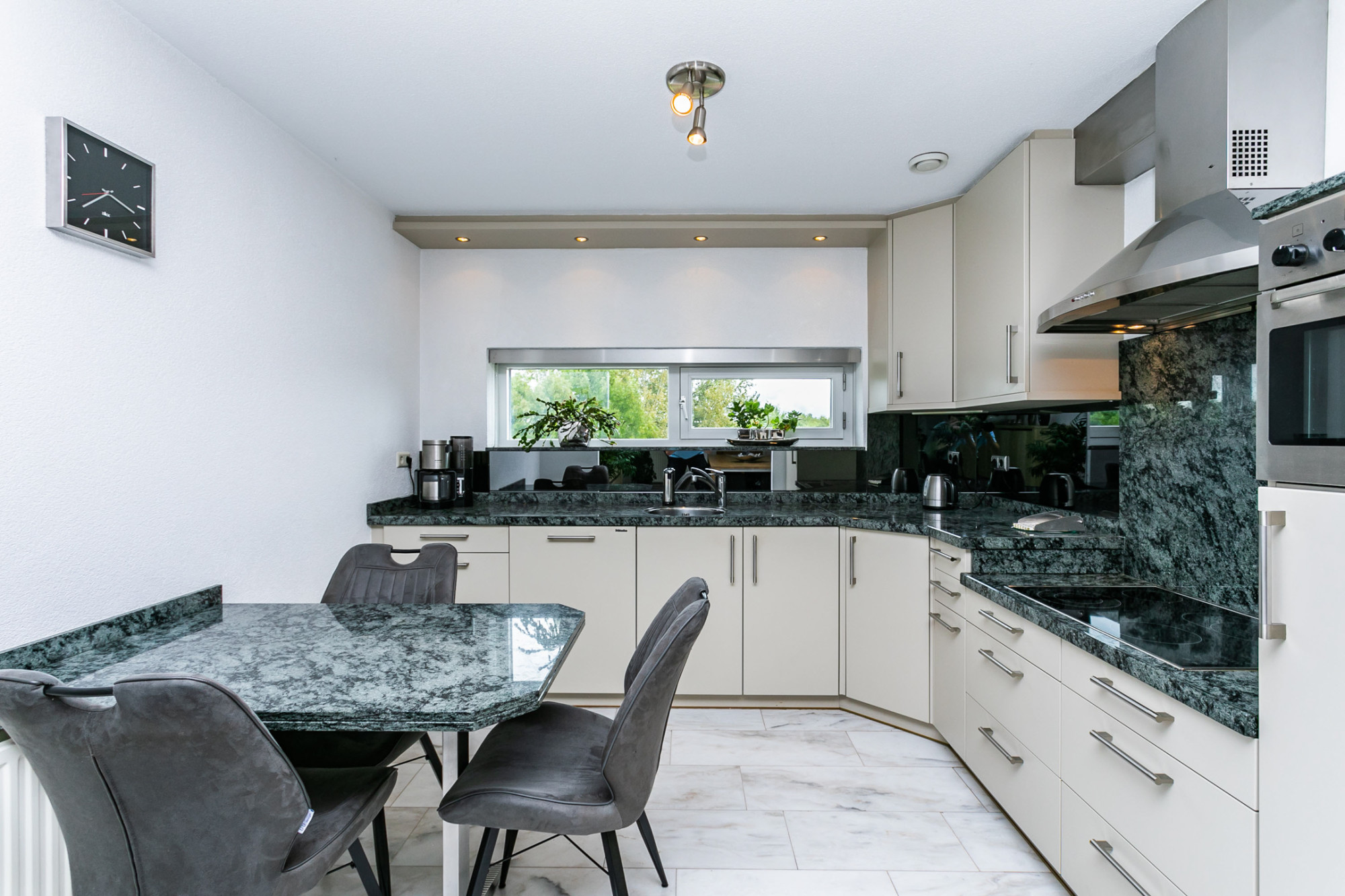 Keukenruimte waar geplaatst een moderne en hoogwaardige inbouwkeuken in hoekopstelling, uitgevoerd in crème-wit met RVS grepen/-afwerking en een granieten werkblad. Veel opbergruimte in soft-close laden en apparatuur, te weten: 4 zones keramische kookplaat / RVS wandschouw afzuigkap / combioven / wasbak / vaatwasmachine en koelkast.