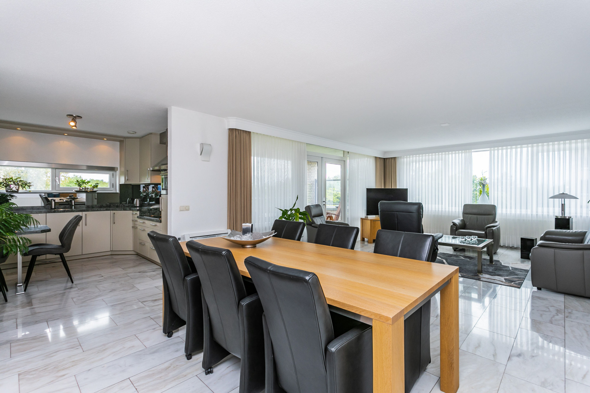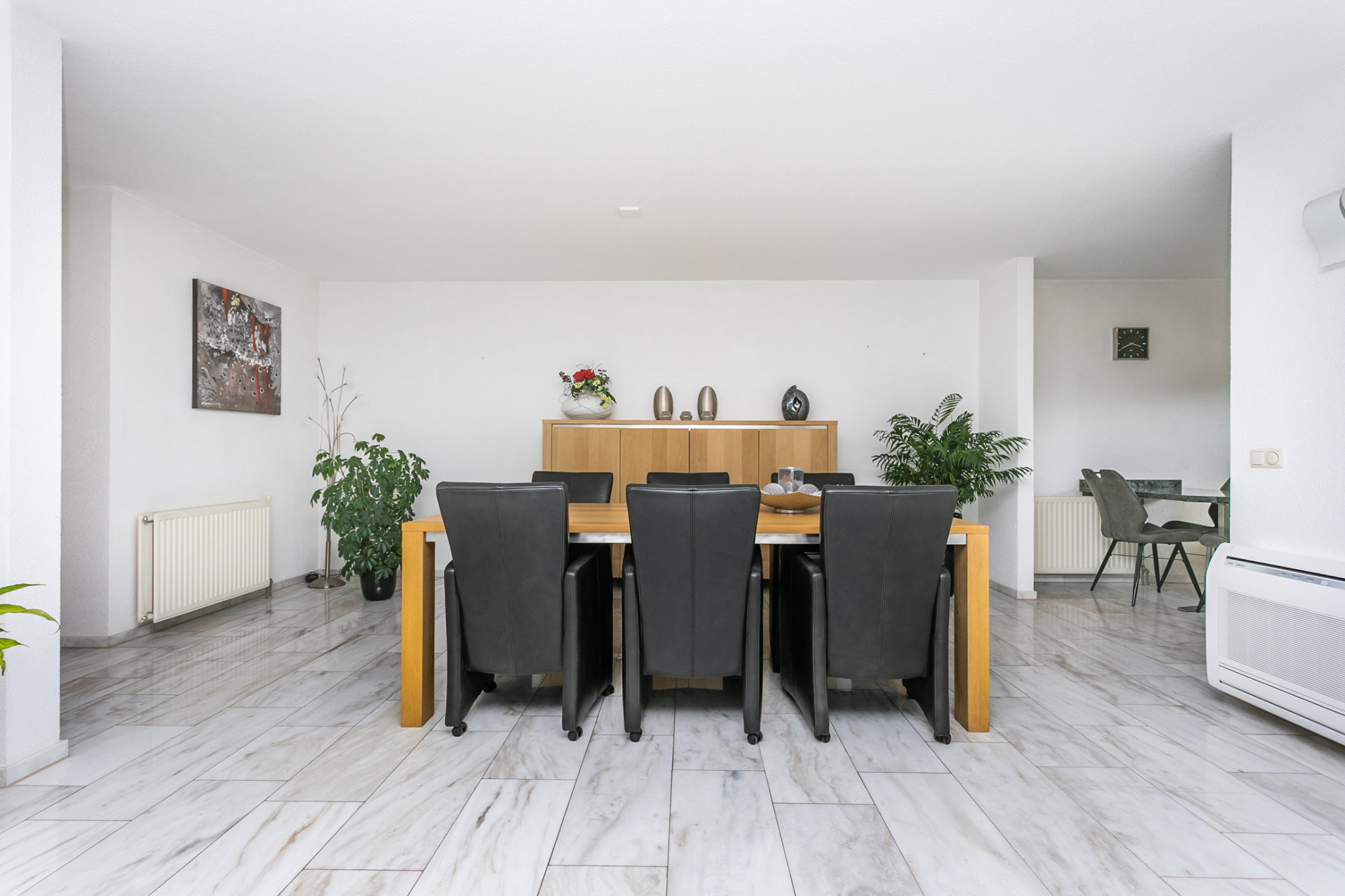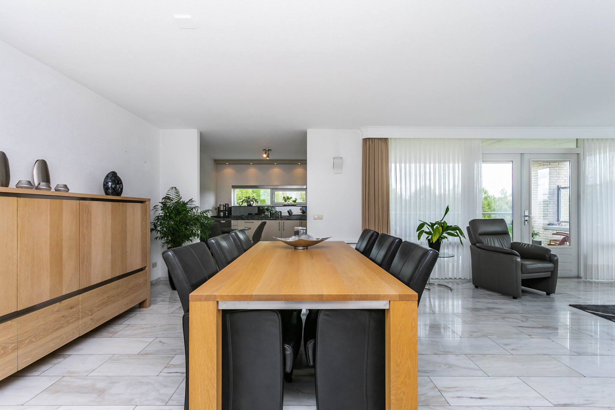Bij binnenkomst in de ruime, lichte L-vormige living valt direct de hoogwaardige afwerking op. De ruimte is voorzien van airconditioning en elektrisch bedienbare zonweringen, zodat u altijd geniet van een aangename temperatuur en voldoende privacy. De eetkamer is centraal gelegen en vormt een verbinding met de moderne, crème-witte inbouwkeuken met granieten werkblad en hoogwaardige apparatuur.