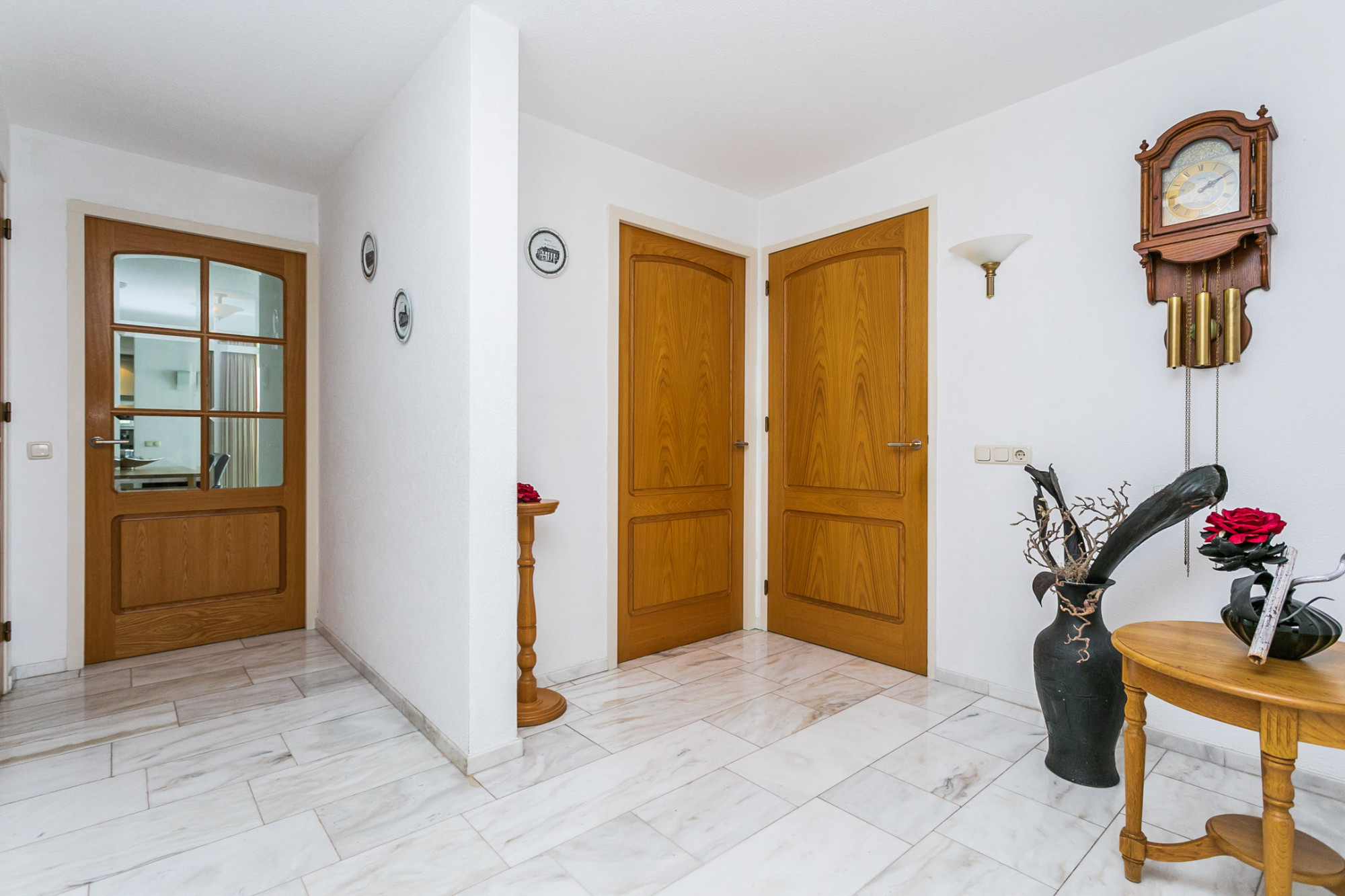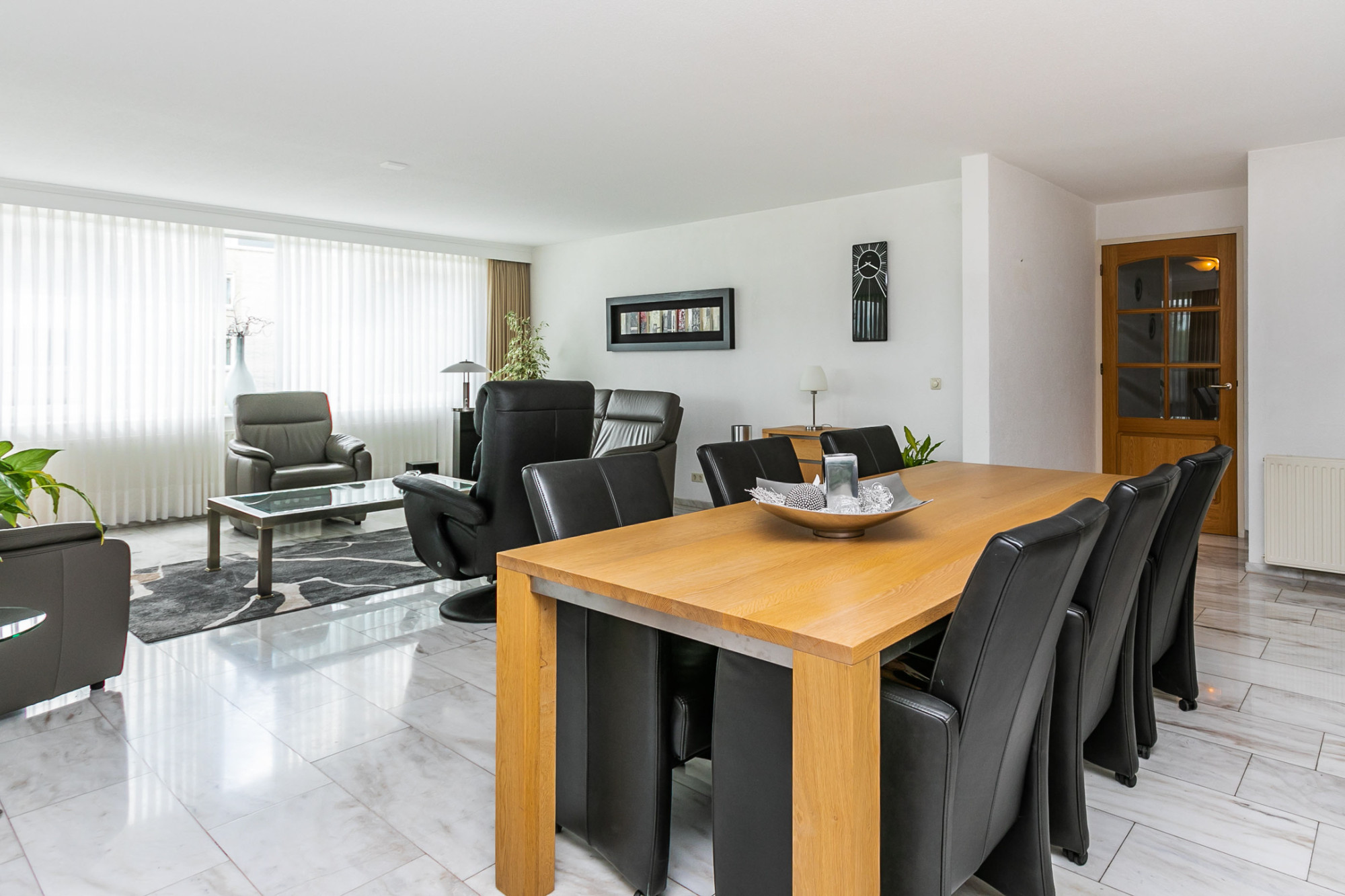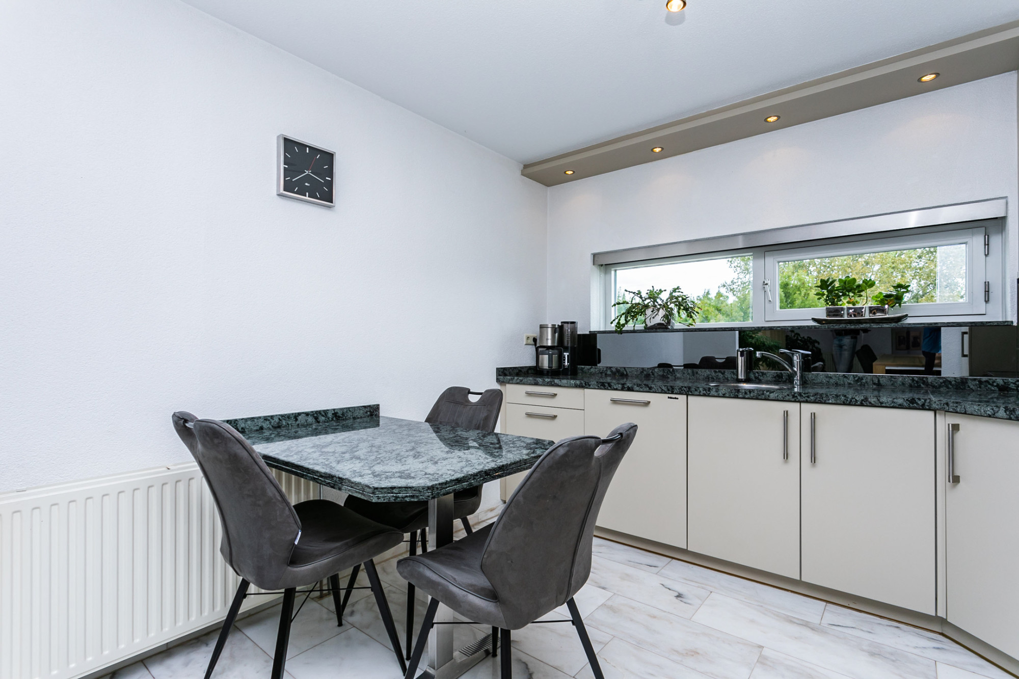 Bij binnenkomst in de ruime, lichte L-vormige living valt direct de hoogwaardige afwerking op. De ruimte is voorzien van airconditioning en elektrisch bedienbare zonweringen, zodat u altijd geniet van een aangename temperatuur en voldoende privacy. De eetkamer is centraal gelegen en vormt een verbinding met de moderne, crème-witte inbouwkeuken met granieten werkblad en hoogwaardige apparatuur.