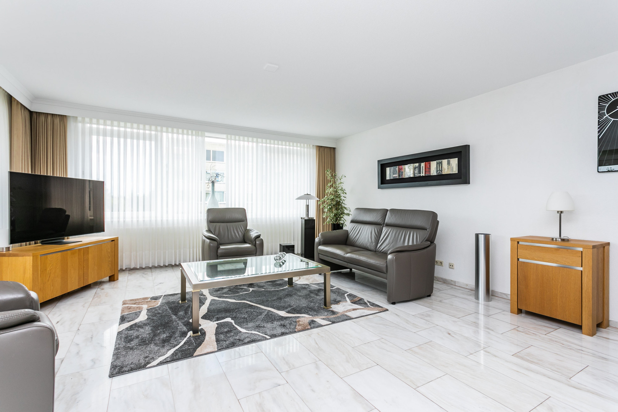 Royale lichte L-vormige woonkamer met moderne afwerking, airconditioningsinstallatie en elektrische bedienbare screendoek-zonwering. Living/lounge met zithoek, multimediale aansluitingen en dubbele openslaande tuindeuren naar het ruime balkon met windscherm en vrij uitzicht. Centraal in de woonkamer geplaatste eethoek welke een verbinding maakt naar de keuken, geheel voorzien van een dorpel-loos gelegde marmervloer.